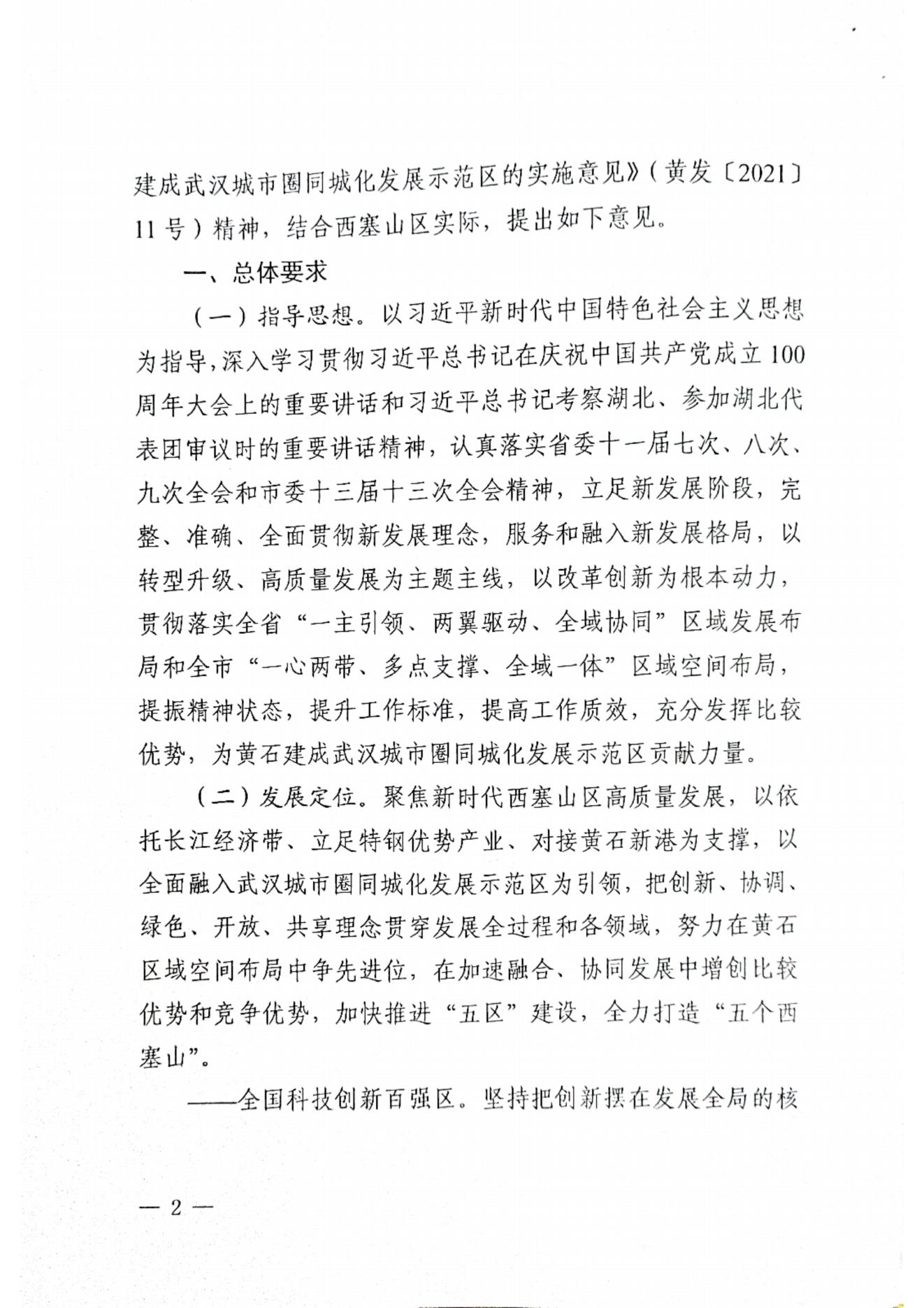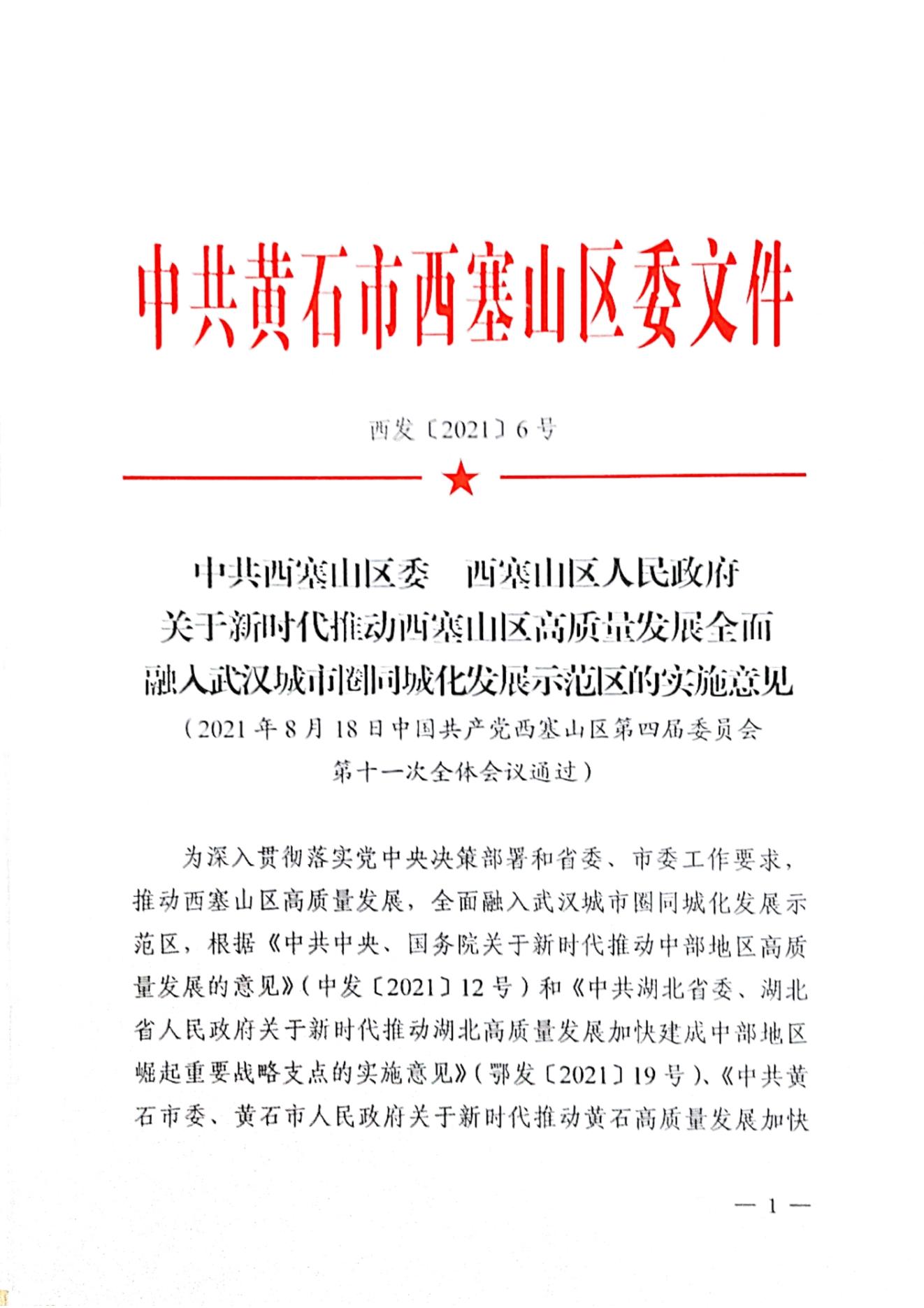 关于新时代推动西塞山区高质量发展全面融入武汉城市圈同城化发展示范区的实施意见