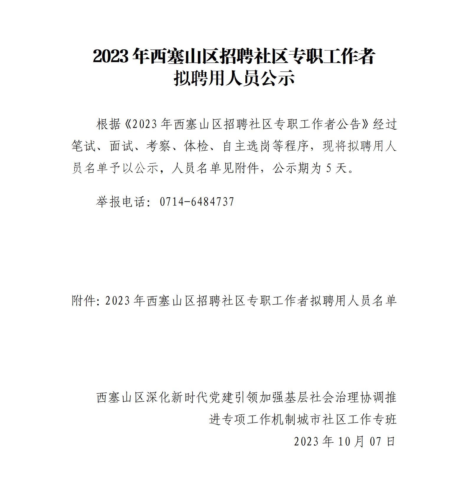 2023年西塞山区招聘社区专职工作者拟聘用人员公示