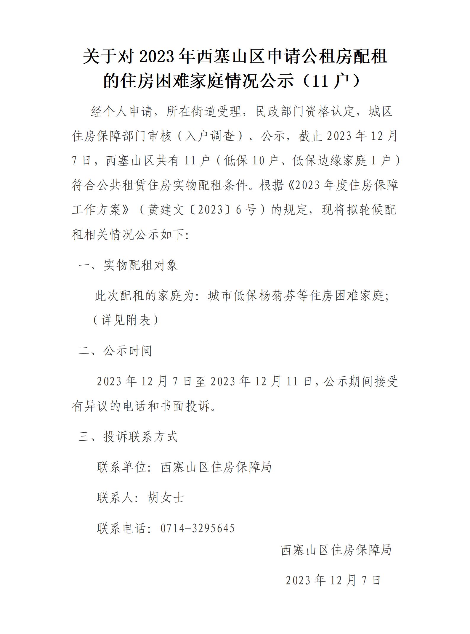 关于对2023年西塞山区申请公租房配租的住房困难家庭情况公示(11户)