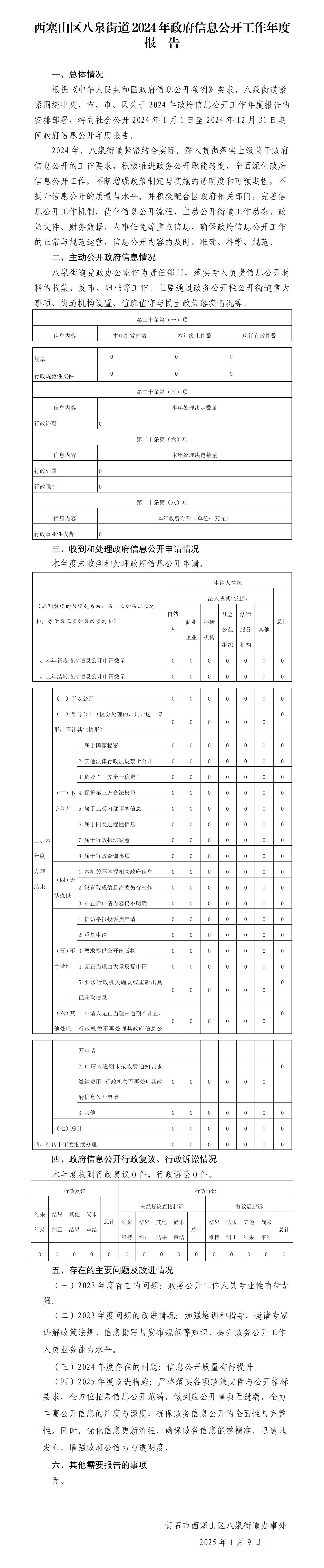 西塞山区八泉街道2024年政府信息公开工作年度报告