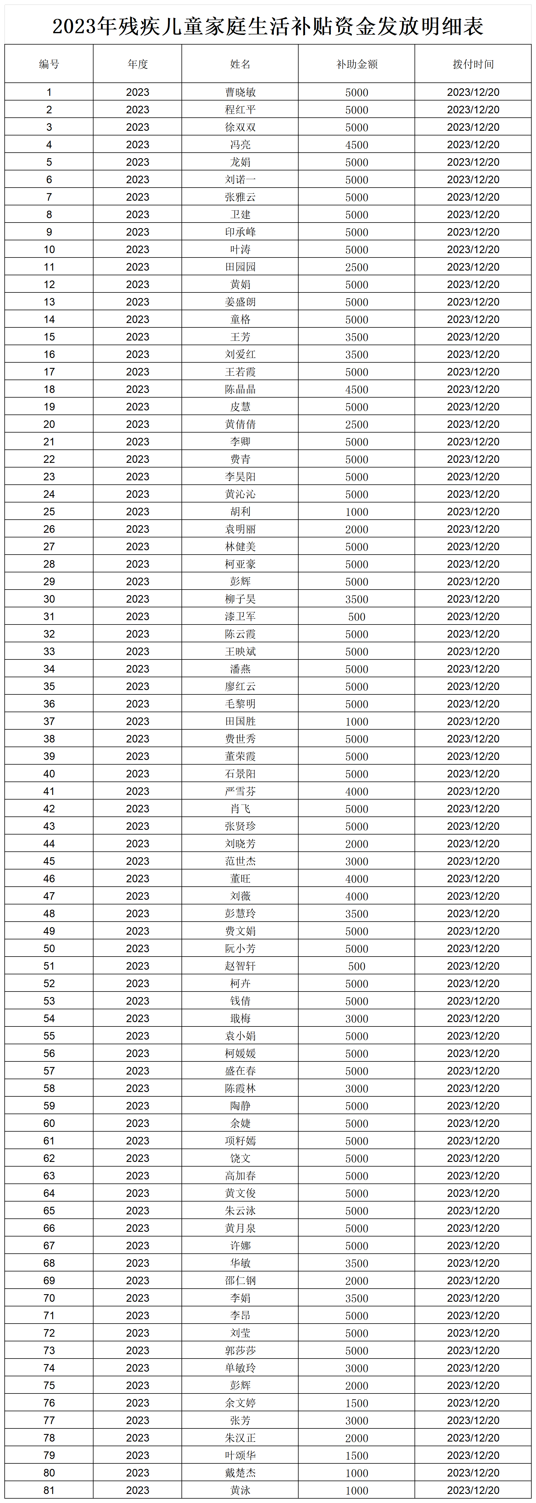 2023年残疾儿童家庭生活补贴资金发放明细表