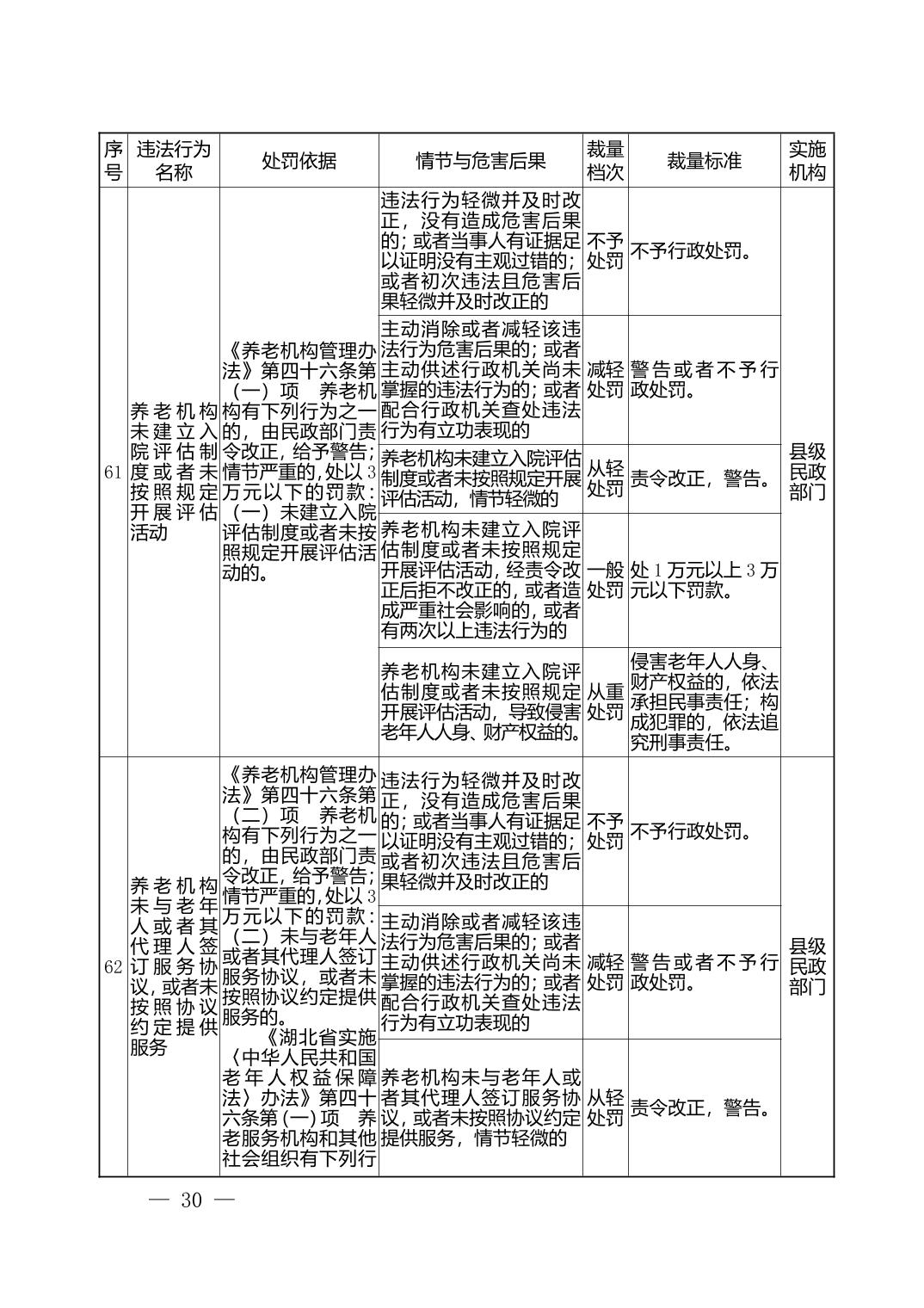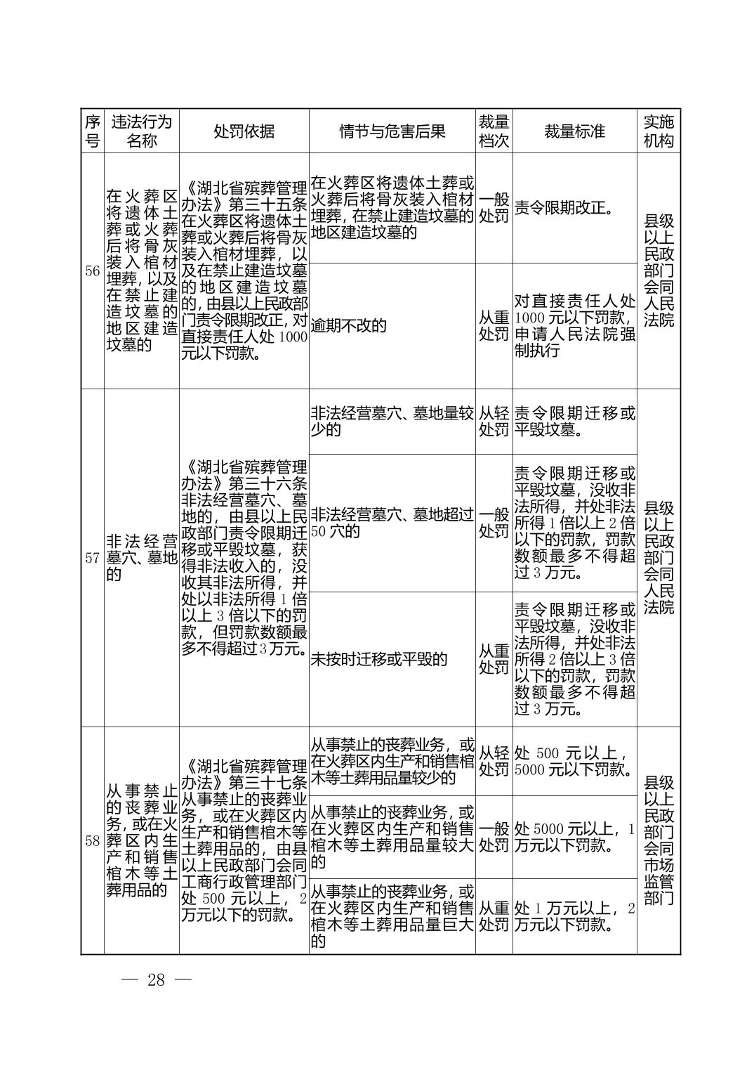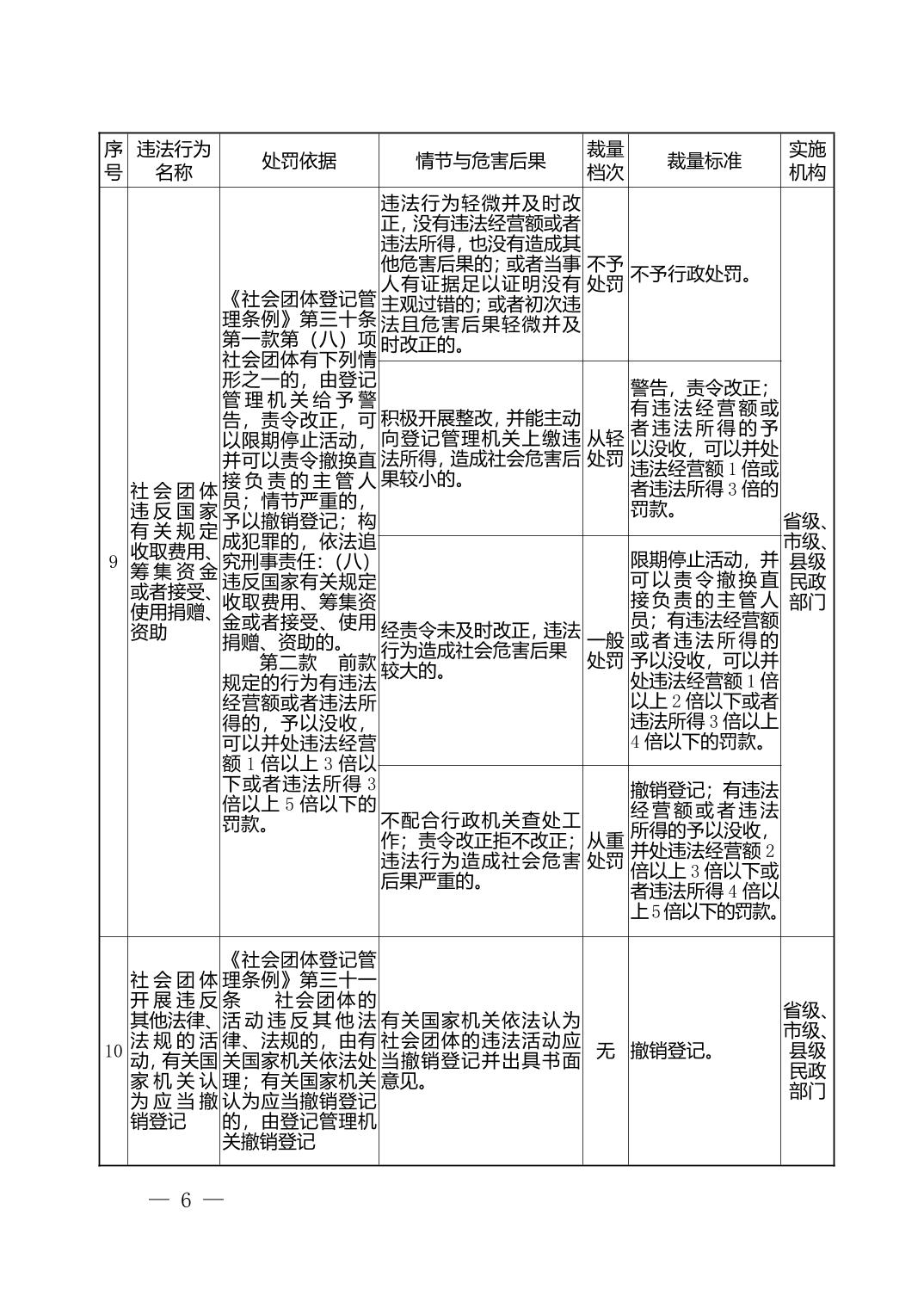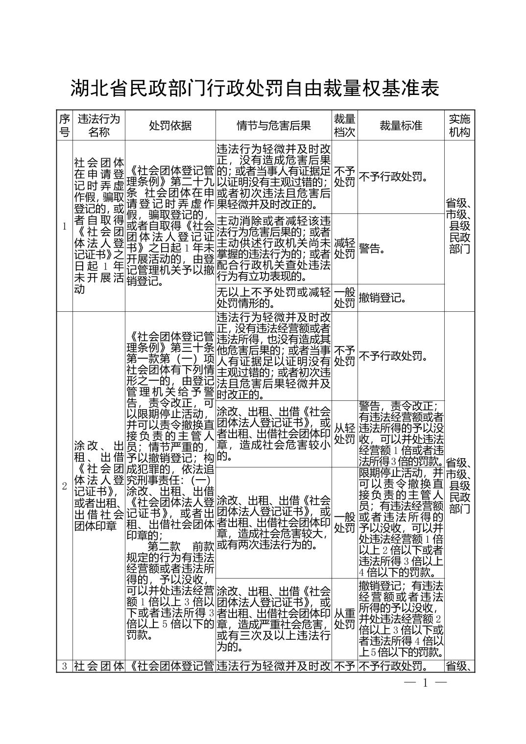 湖北省民政部门行政处罚自由裁量权基准表