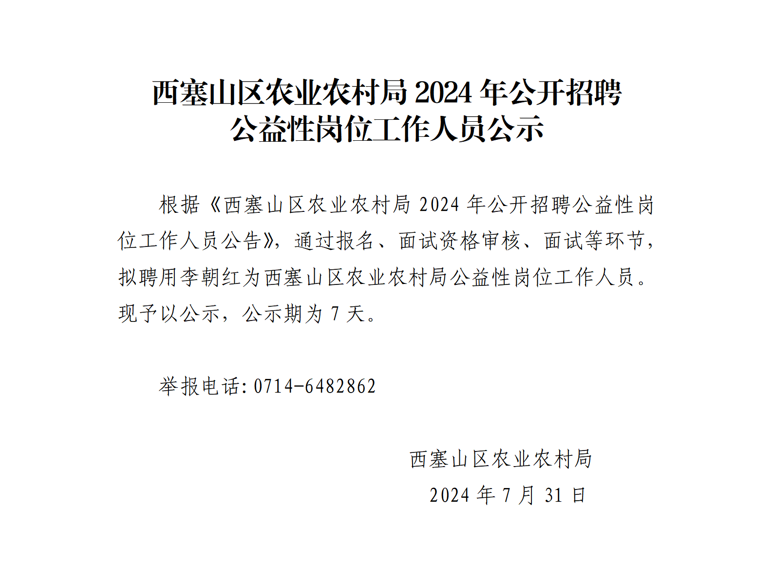 西塞山区农业农村局2024年公开招聘公益性岗位工作人员公示