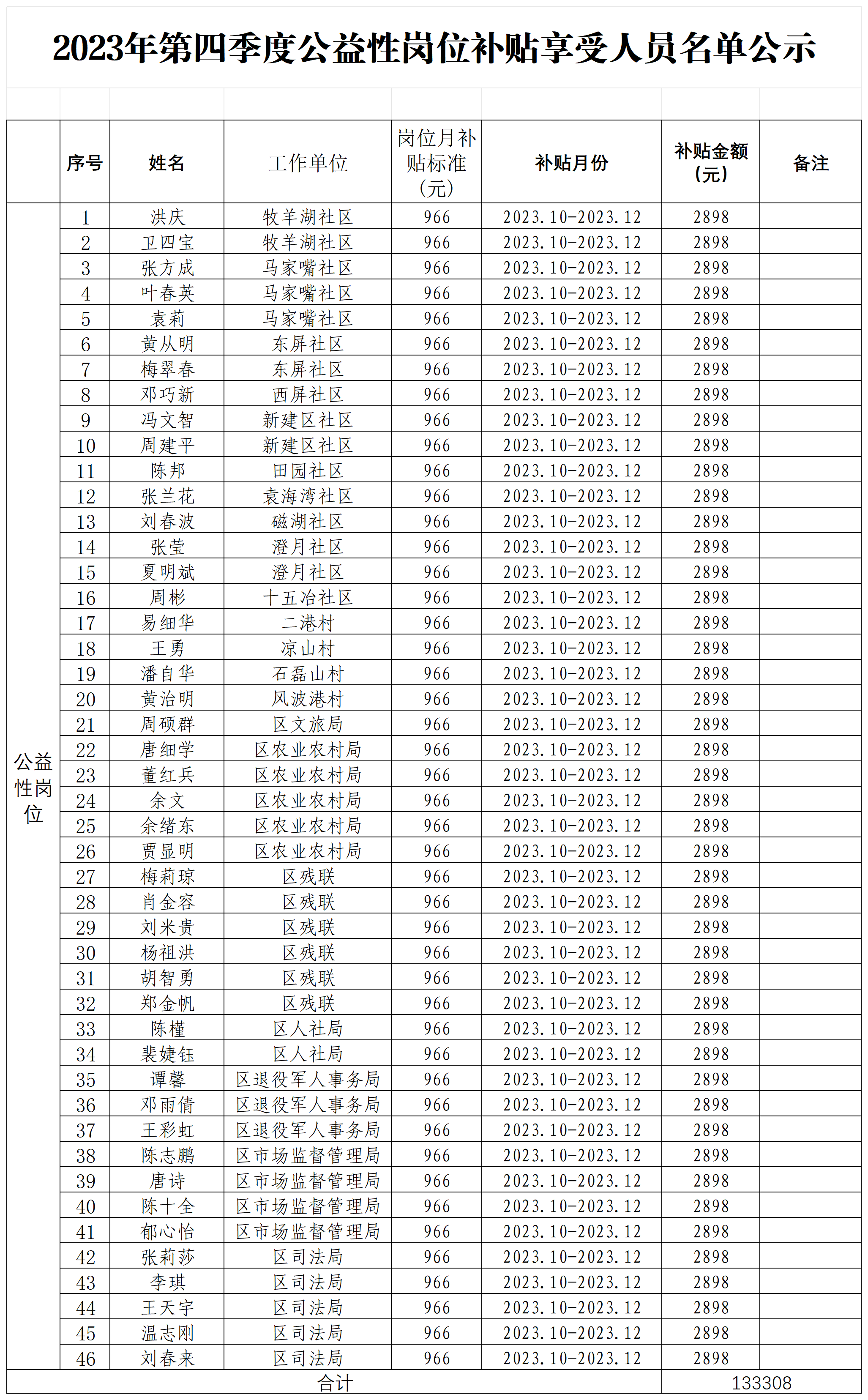 2023年第四季度公益性岗位补贴享受人员名单公示