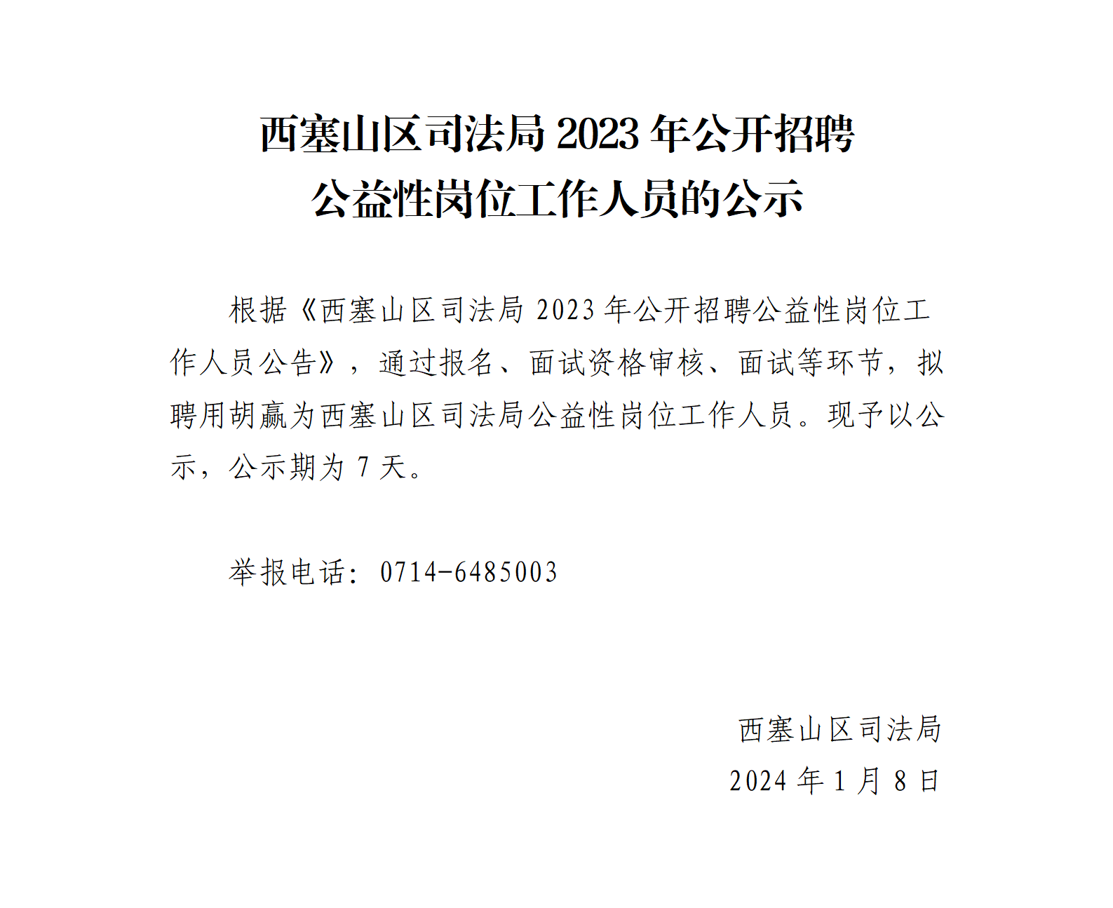 西塞山区司法局2023年公开招聘公益性岗位工作人员的公示