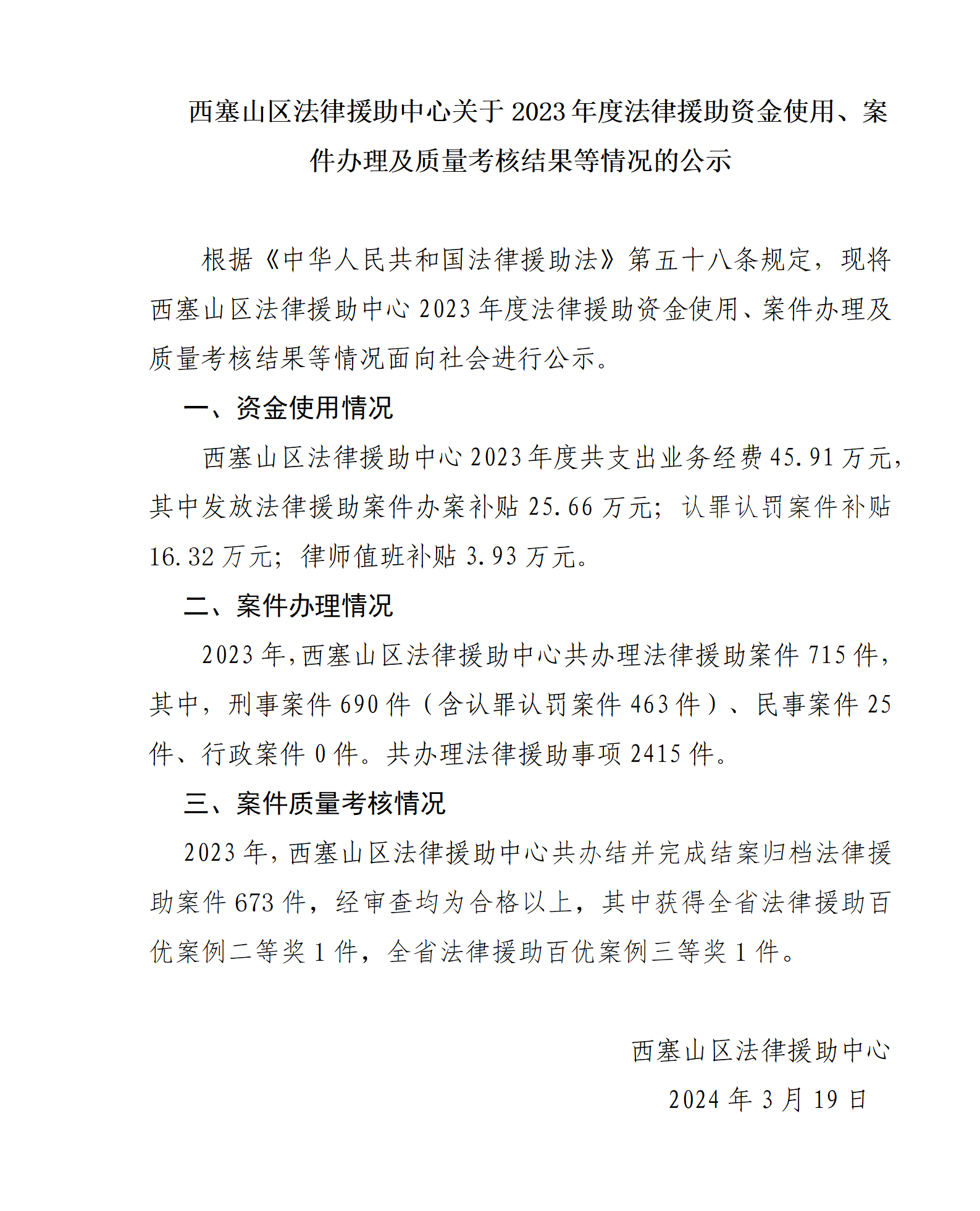 西塞山区法律援助中心关于2023年度法律援助资金使用、案件办理及质量考核结果等情况的公示