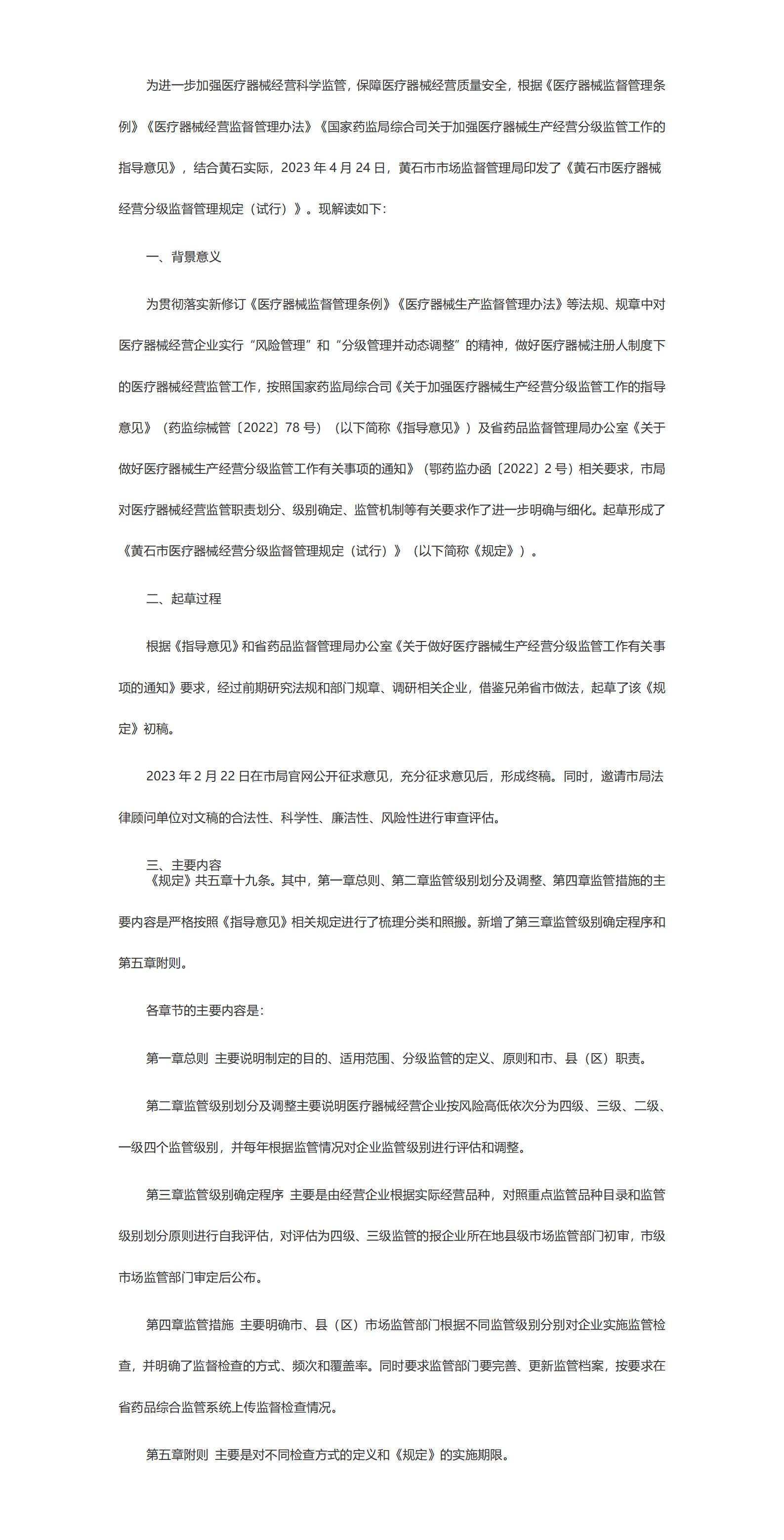 关于《黄石市医疗器械经营分级监督管理规定(试行)》解读