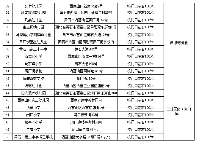 西塞山区校园周边食品摊贩禁售区域范围明细表