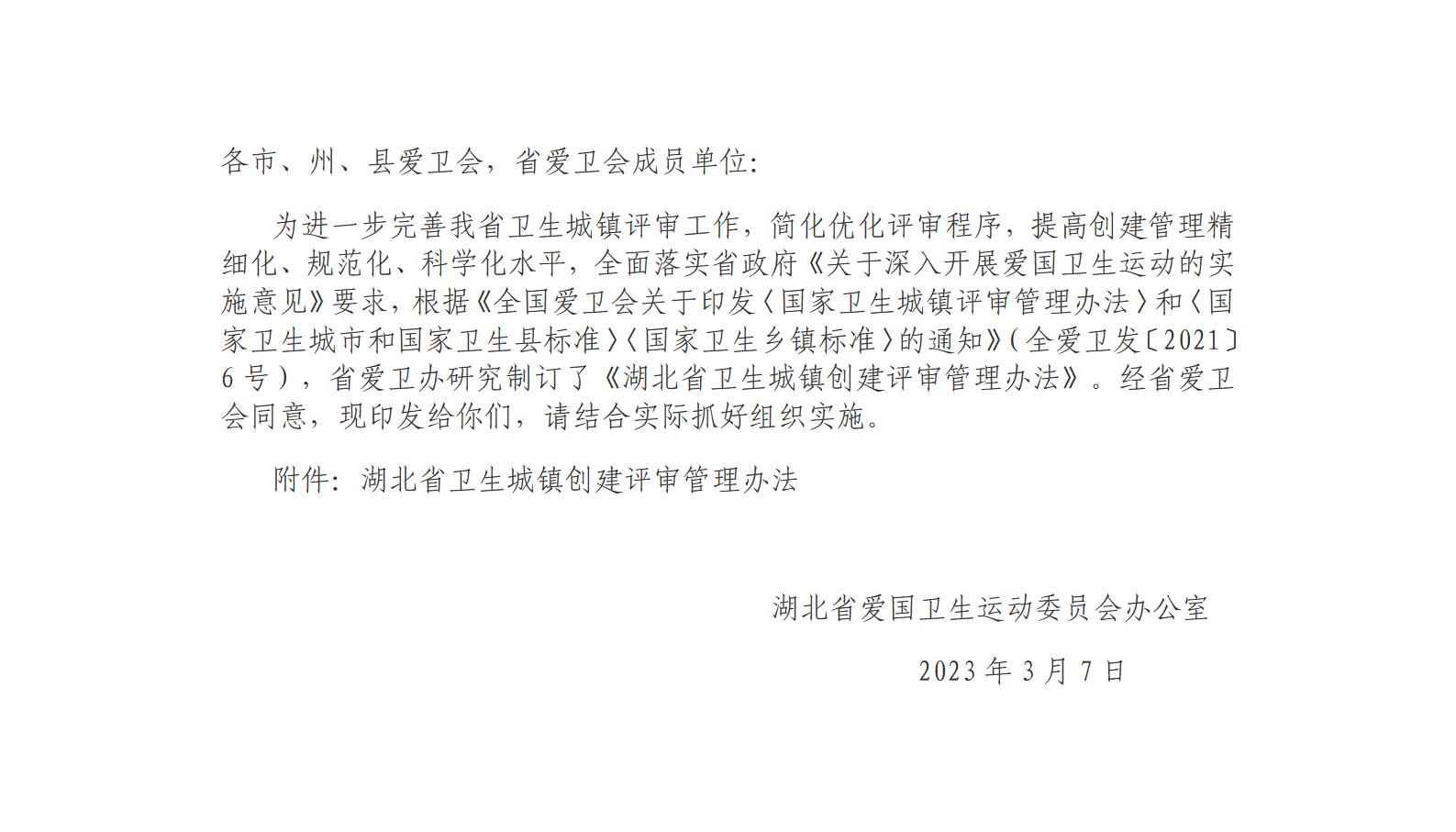 省爱卫办关于印发《湖北省卫生城镇创建评审管理办法》的通知