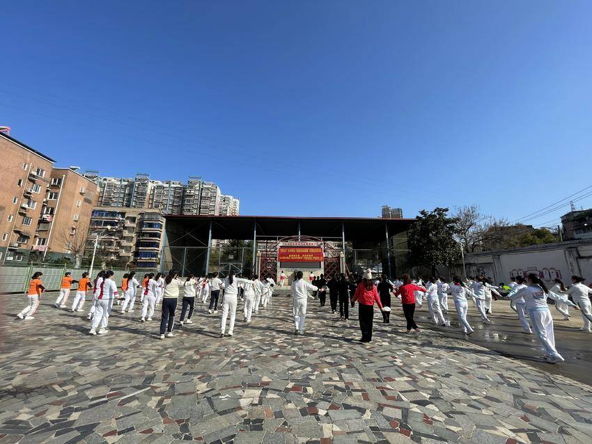 广场另一处,体育指导员老师教学着《乒乓操》《科目三》等舞蹈,大家认真学习、相互交流,伴随着欢快的音乐,大家舞步整齐统一,成为一道靓丽的风景线。