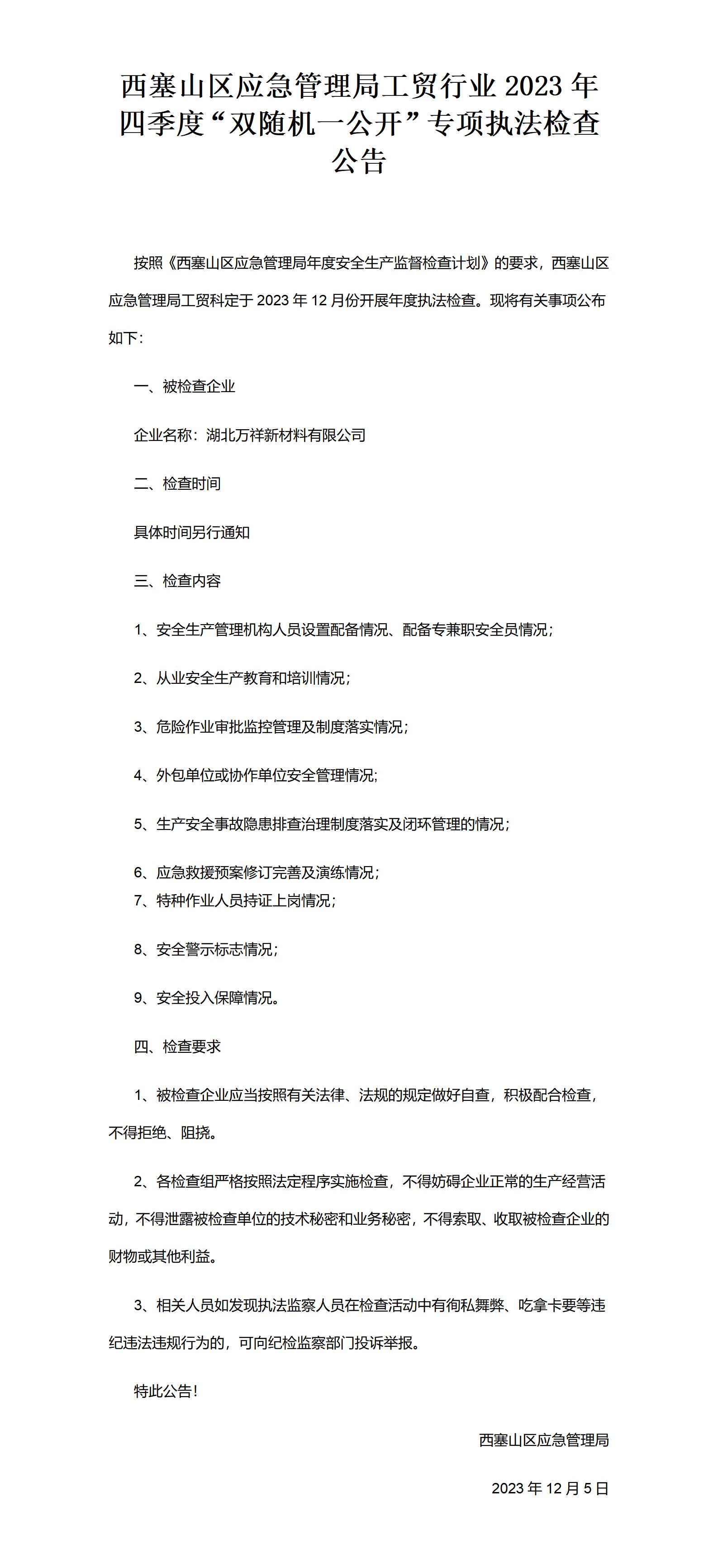 西塞山区应急管理局工贸行业2023年四季度“双随机、一公开”专项执法检查公告