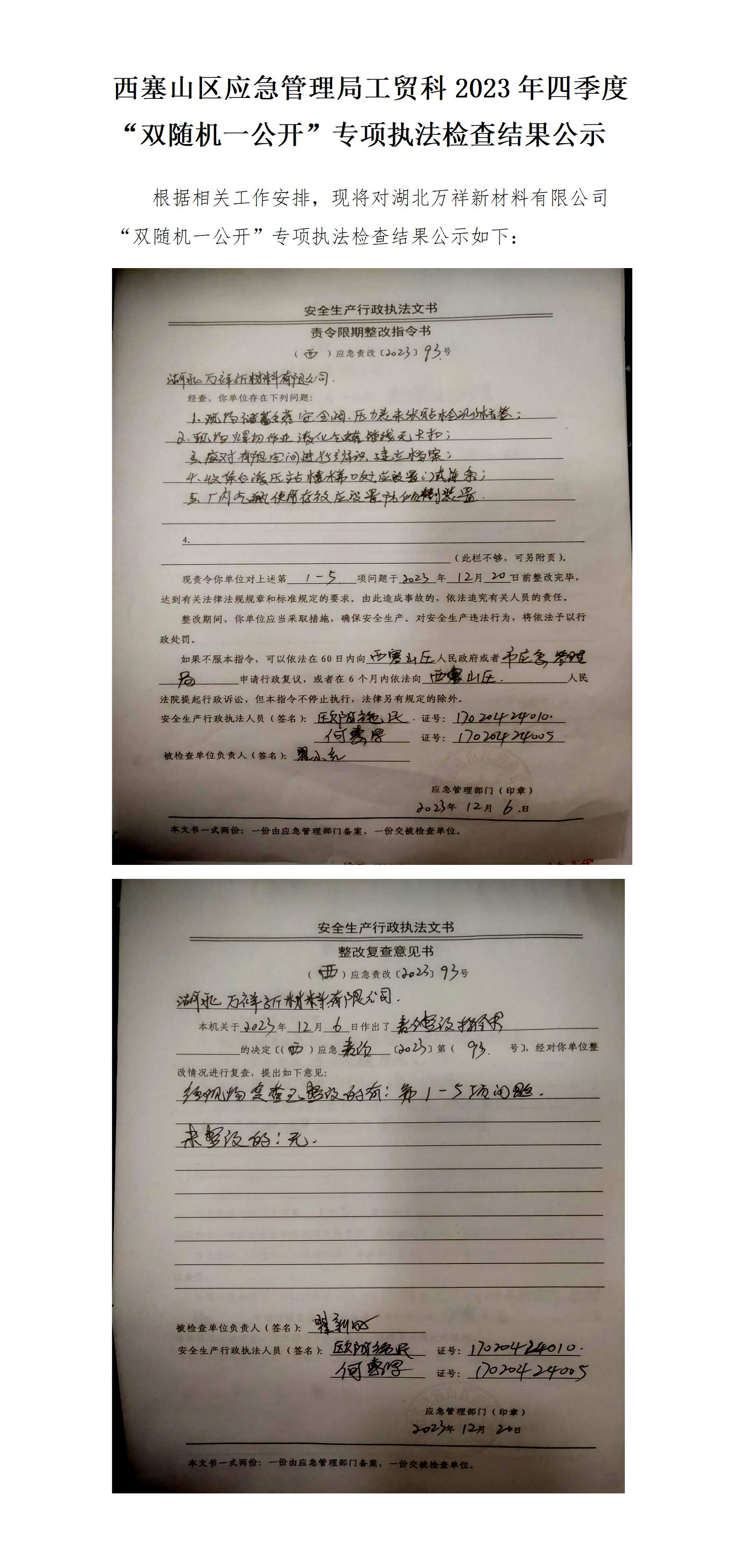 西塞山区应急管理局工贸科2023年四季度“双随机、一公开”专项执法检查结果公示