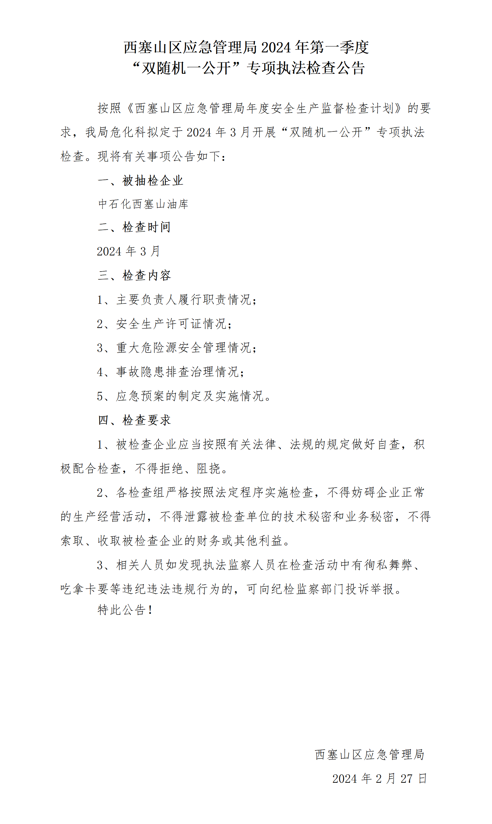 西塞山区应急管理局2024年第一季度 “双随机、一公开”专项执法检查公告