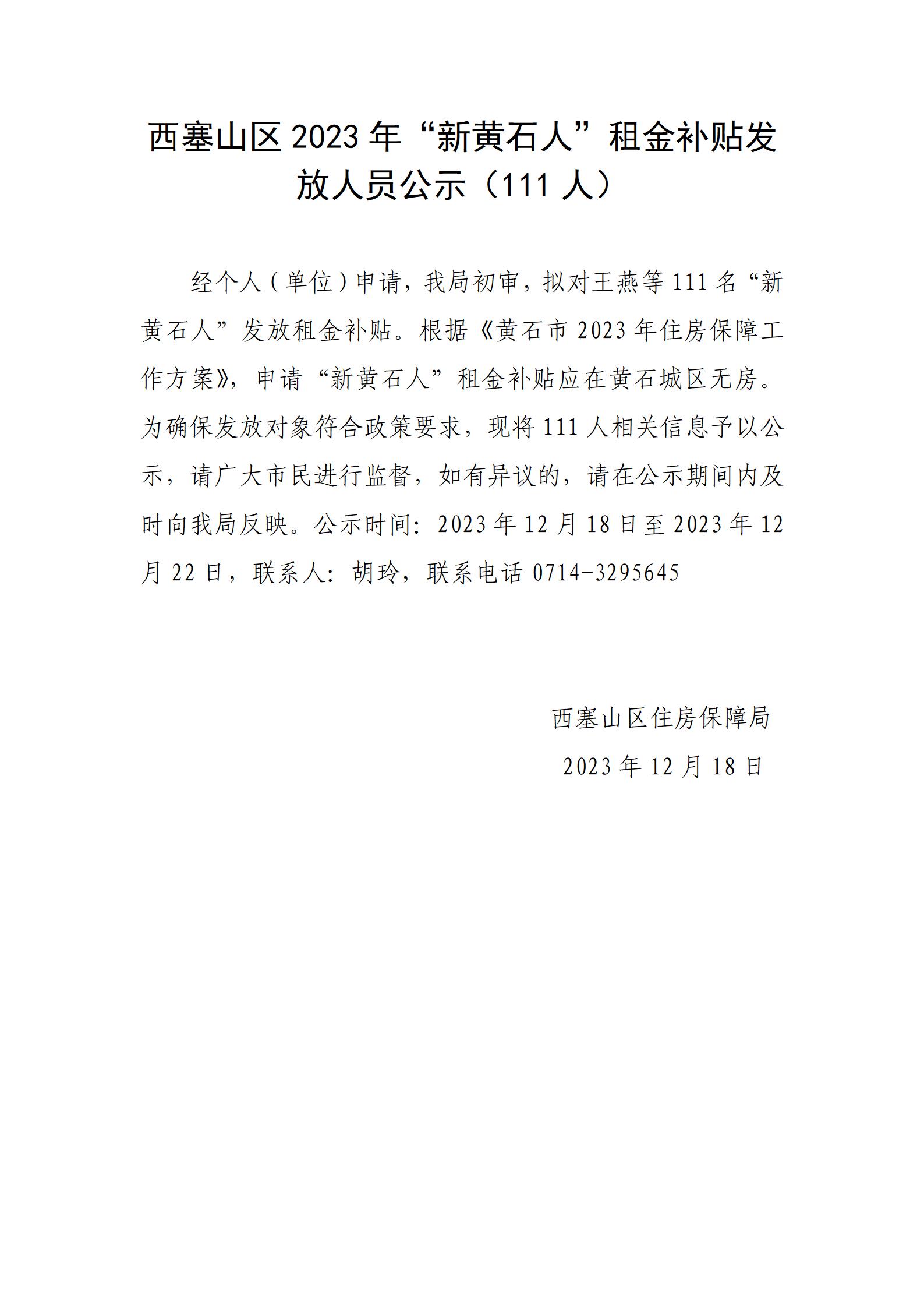 西塞山区2023年“新黄石人”租金补贴发放人员公示(111人)