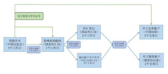 合格境外投资者资格许可法定时限为10个工作日,承诺办理时限5个工作日;特殊机构赋码办理时限1个工作日;外汇登记办理时限2个工作日;银行账户开户许可办理时限2个工作日;证券期货账户开立时限2个交易日。托管人衔接办理时限如(二)所列。办理时限自托管人完成尽职调查等工作后、各单位收到完整材料起算。