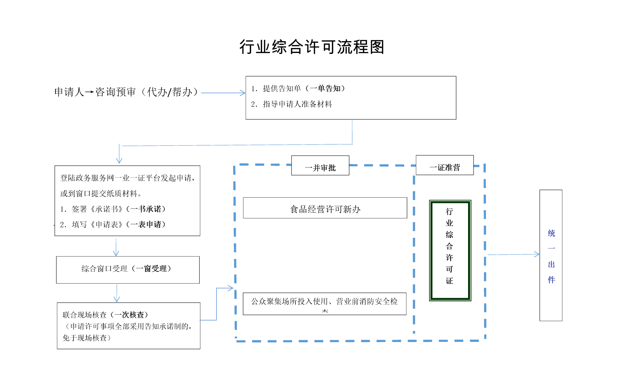 审批机关制作《食堂行业综合许可告知单》。在申请人业务咨询和正式提报申请前一次性告知其该行业许可涉及的审批事项、设定依据、许可条件、申请材料、申请方式、办理流程等。