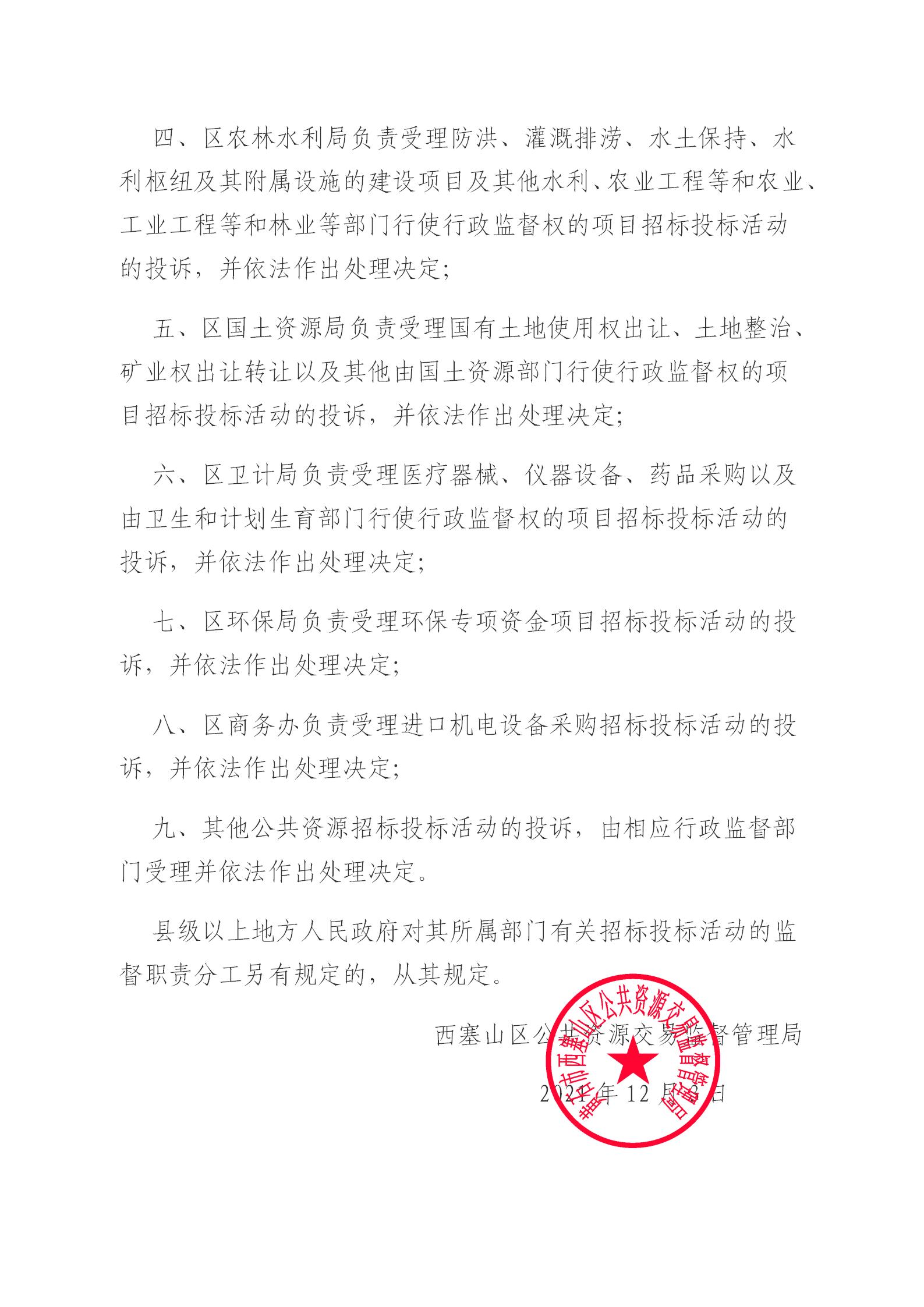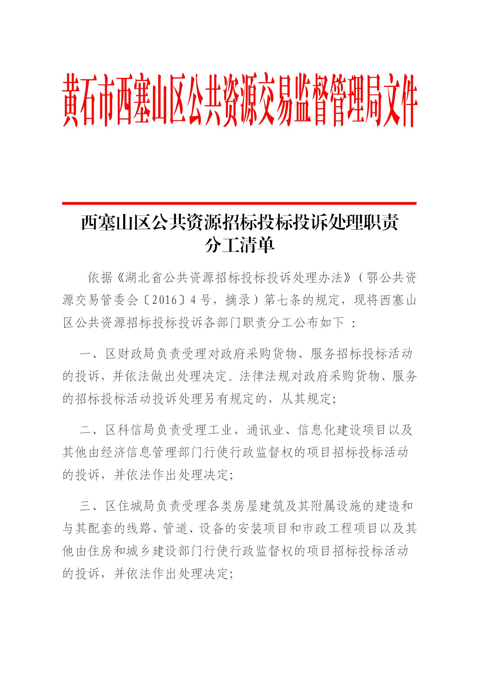 西塞山区公共资源招标投标投诉处理职责分工清单