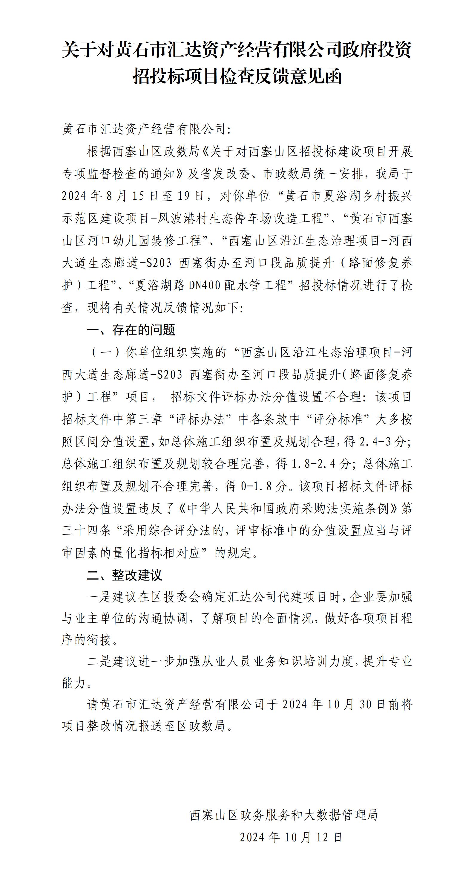 关于对黄石市汇达资产经营有限公司政府投资招投标项目检查反馈意见函