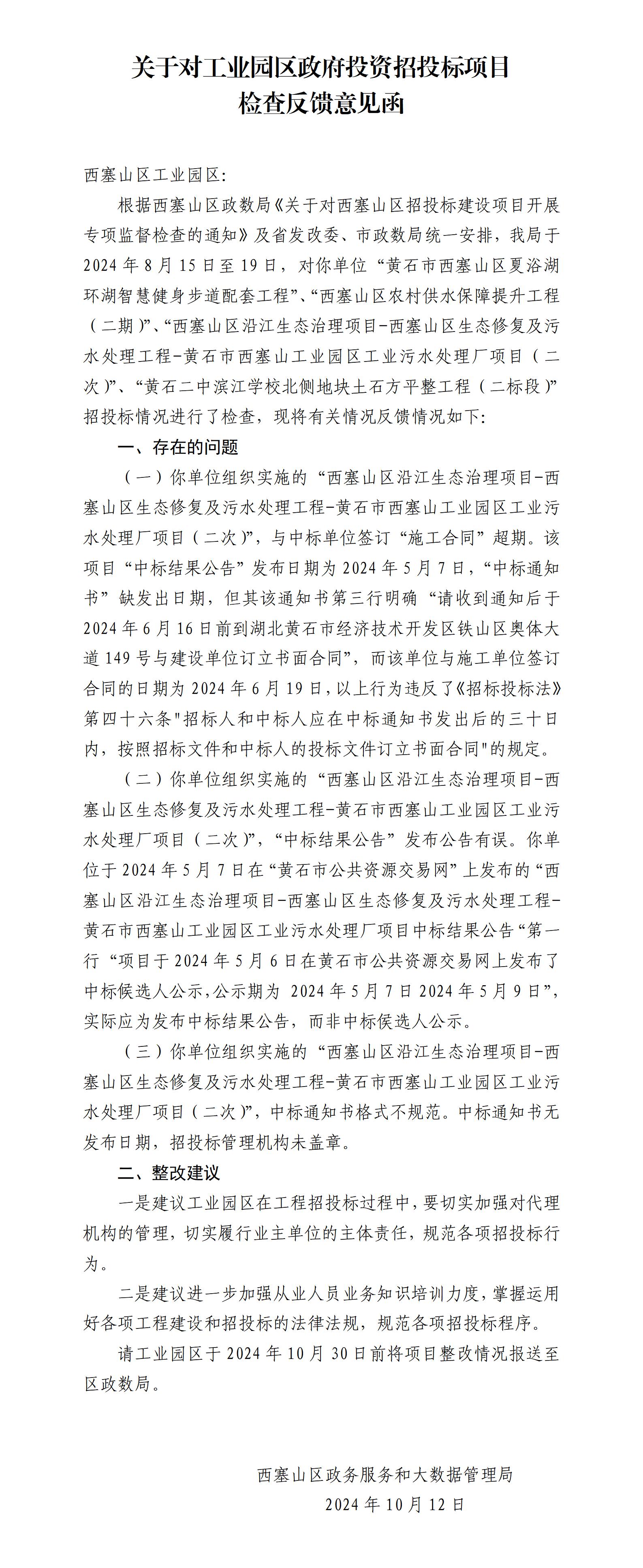 关于对工业园区政府投资招投标项目检查反馈意见函
