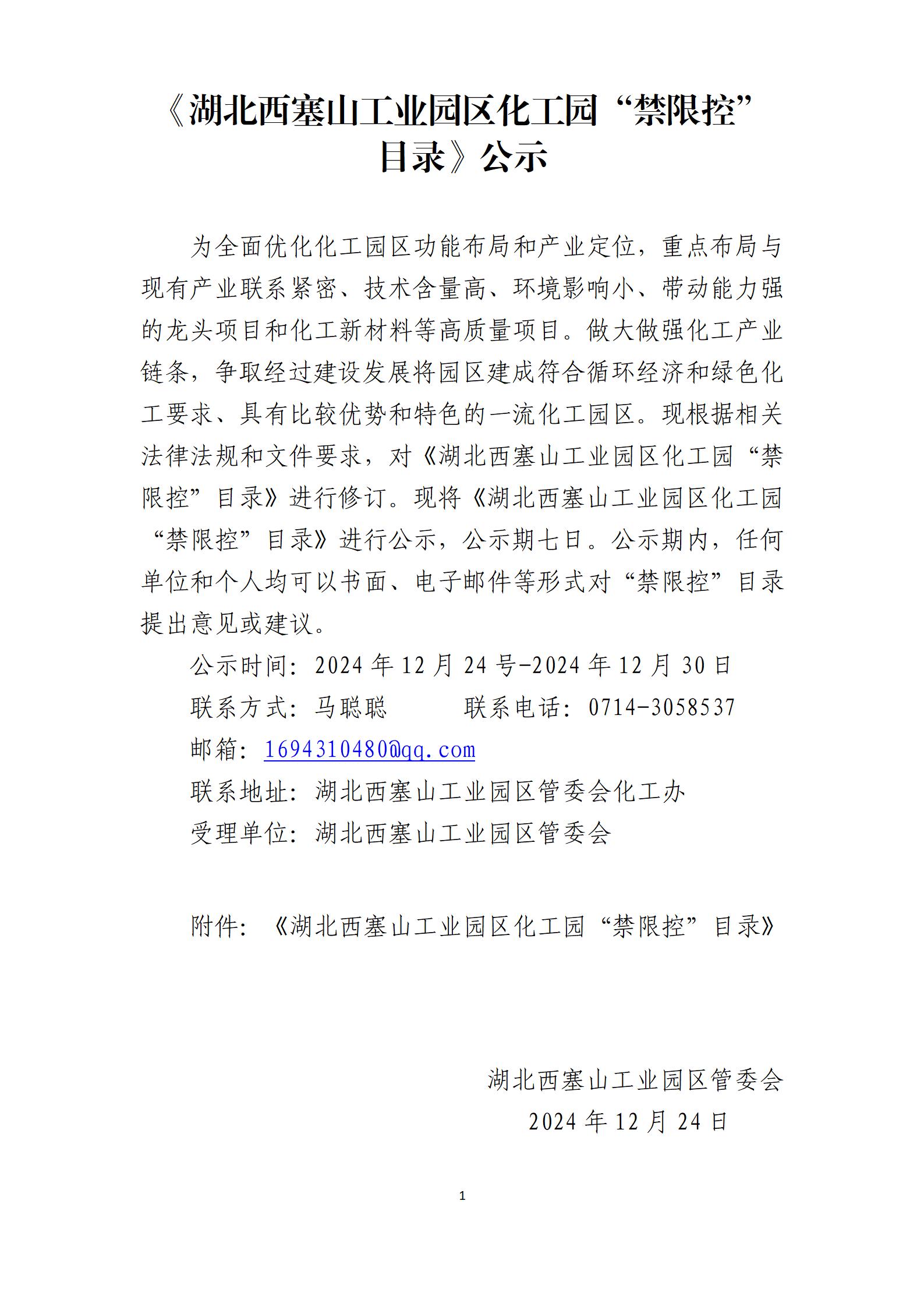 《湖北西塞山工业园区化工园“禁限控” 目录》公示