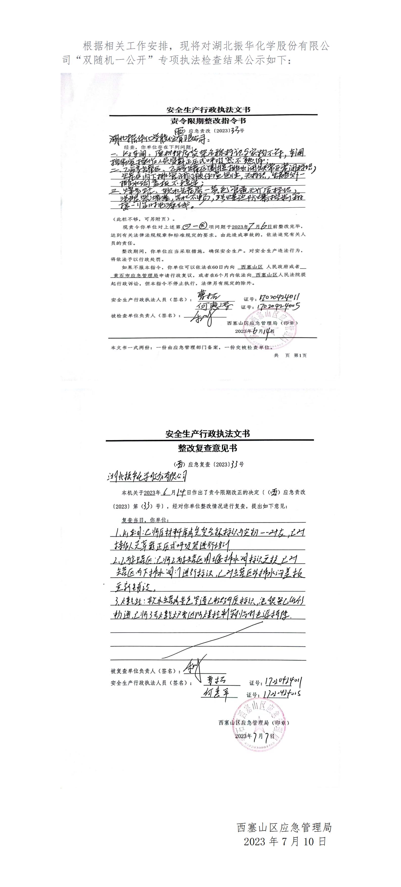 西塞山区应急管理局危化科2023年二季度“双随机、一公开”专项执法检查结果公示