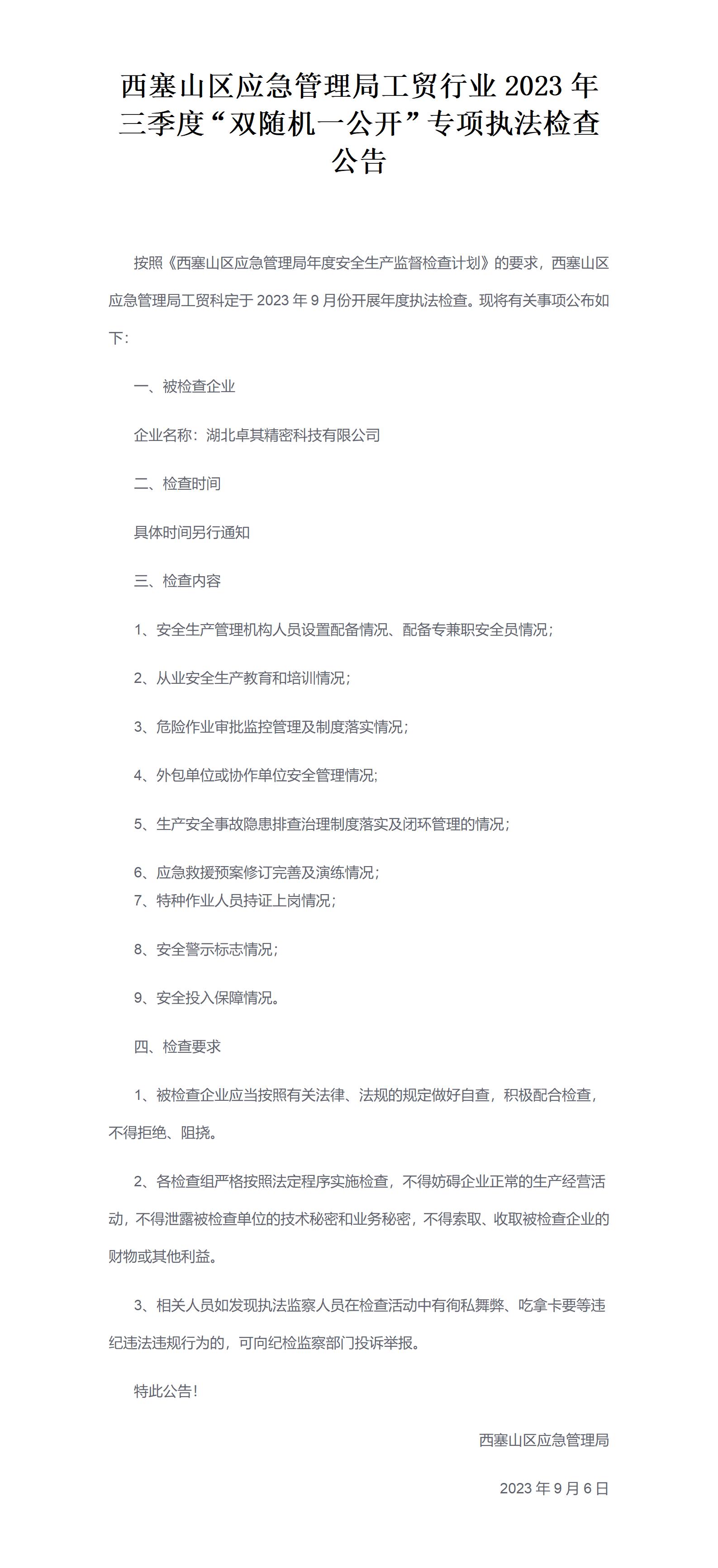 西塞山区应急管理局工贸行业2023年三季度“双随机、一公开”专项执法检查公告
