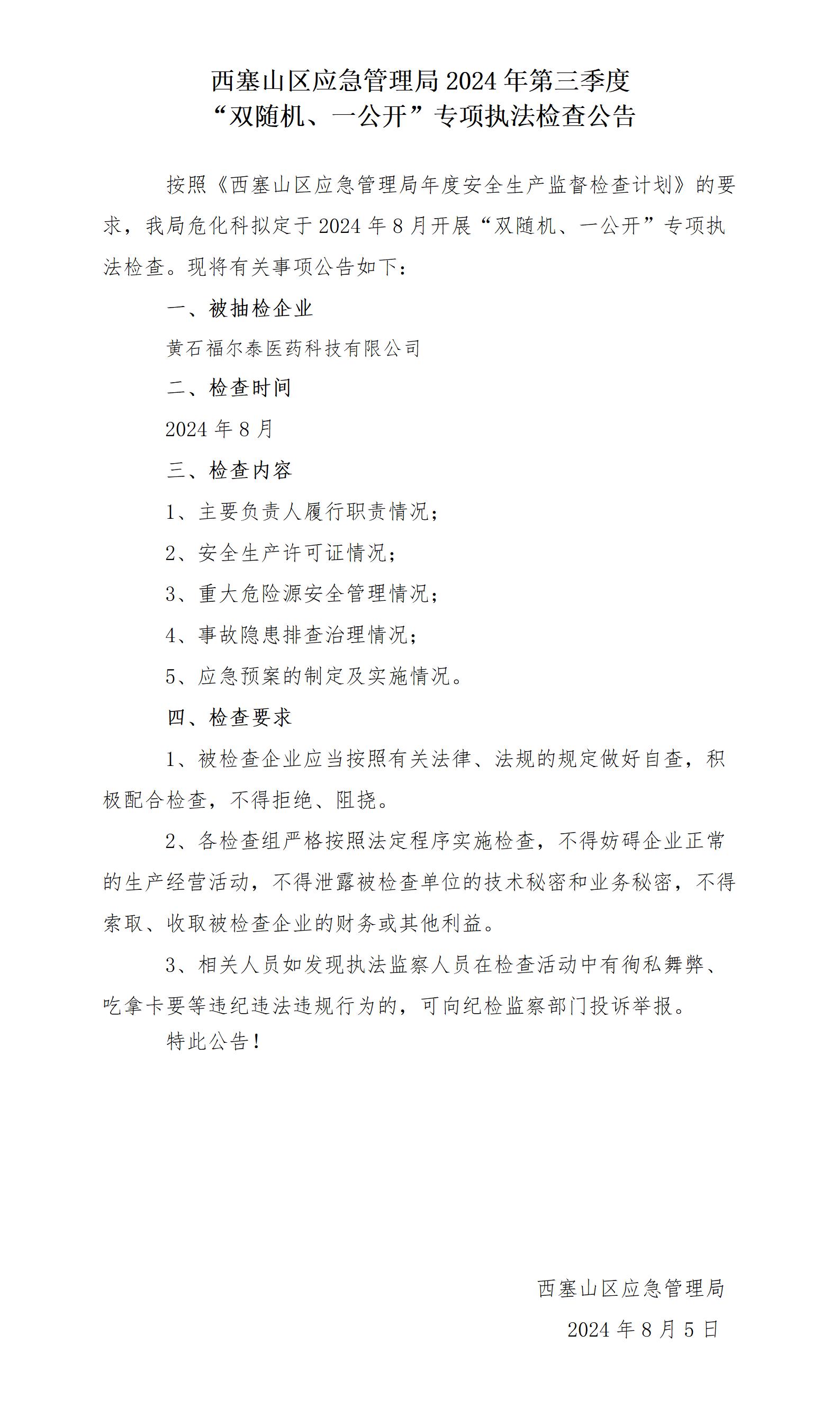 西塞山区应急管理局2024年第三季度 “双随机、一公开”专项执法检查公告
