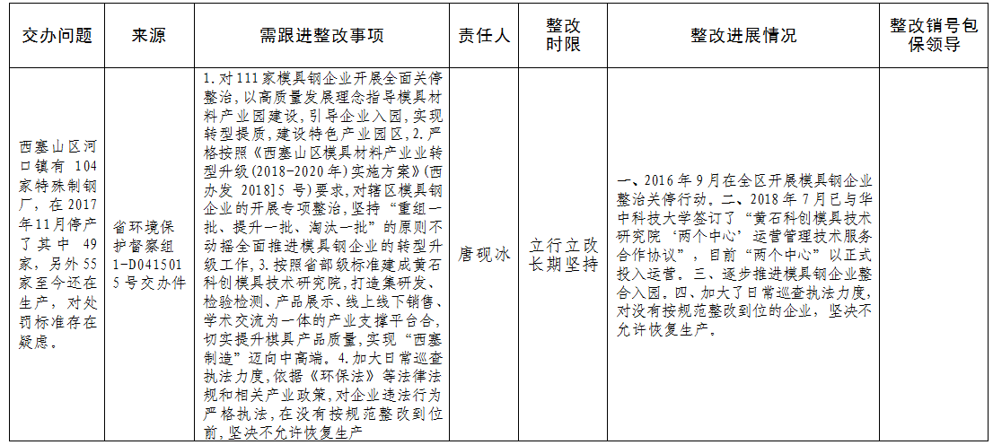 二、整改情况:一、2016年9月在全区开展模具钢企业整治关停行动。二、2018年7月已与华中科技大学签订了“黄石科创模具技术研究院‘两个中心’运营管理技术服务合作协议”,目前“两个中心”以正式投入运营。三、逐步推进模具钢企业整合入园。四、加大了日常巡查执法力度,对没有按规范整改到位的企业,坚决不允许恢复生产。