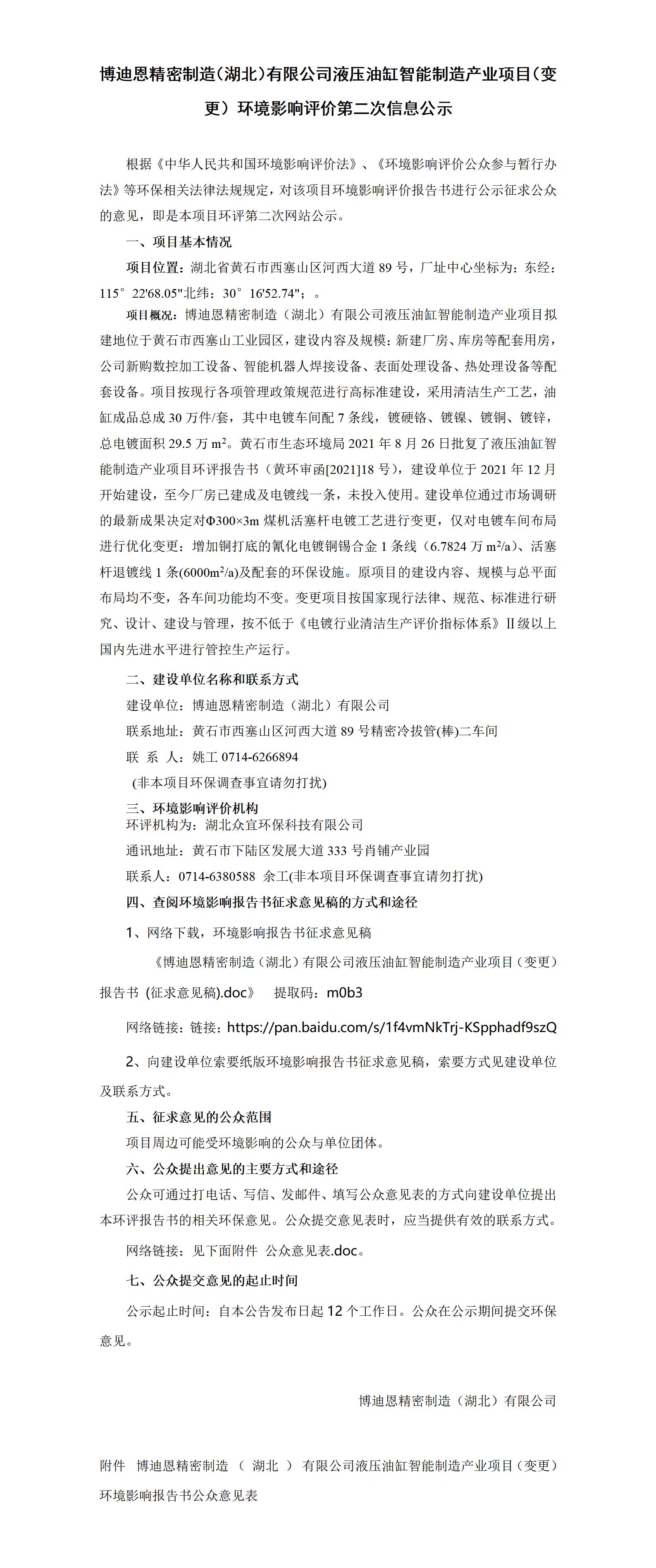 博迪恩精密制造(湖北)有限公司液压油缸智能制造产业项目(变更)环境影响评价第二次信息公示