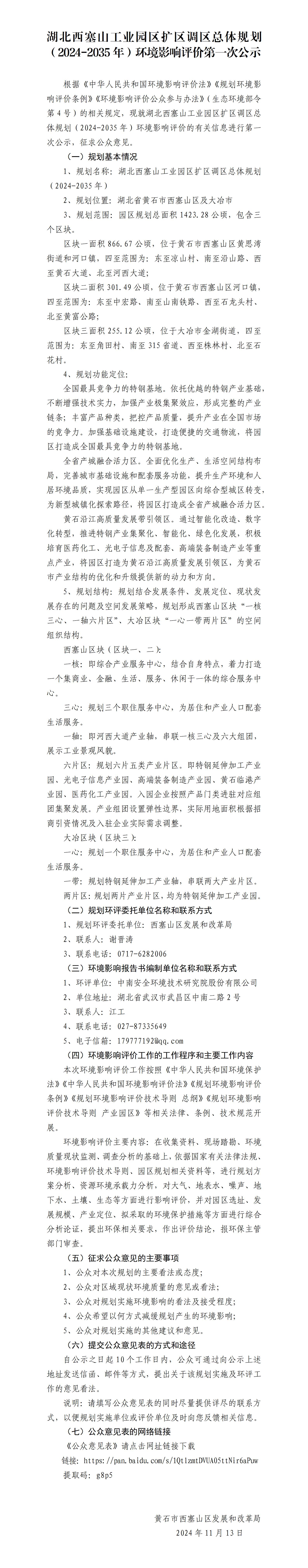 湖北西塞山工业园区扩区调区总体规划(2024-2035年)环境影响评价第一次公示