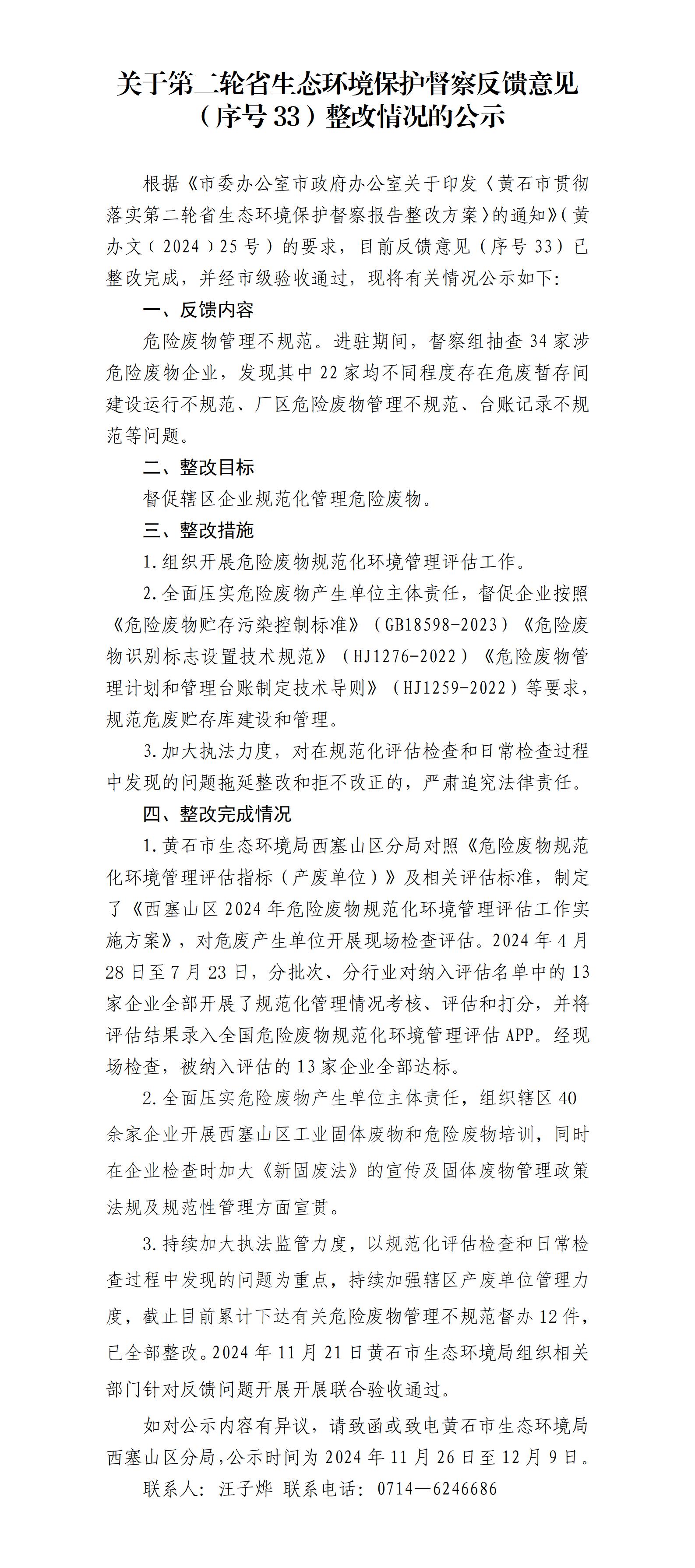 关于第二轮省生态环境保护督察反馈意见(序号33)整改情况的公示