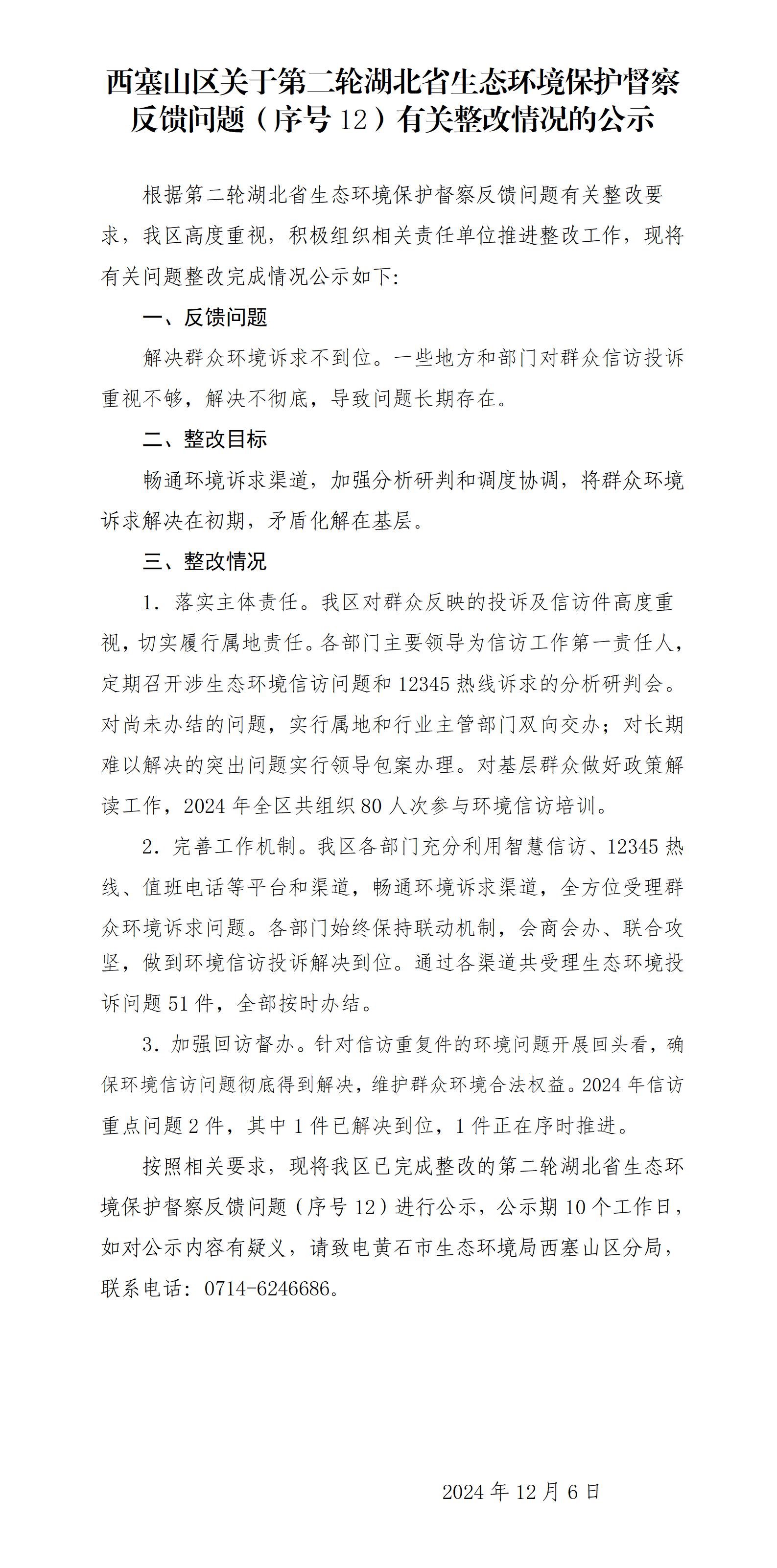 西塞山区关于第二轮湖北省生态环境保护督察反馈问题(序号12)有关整改情况的公示
