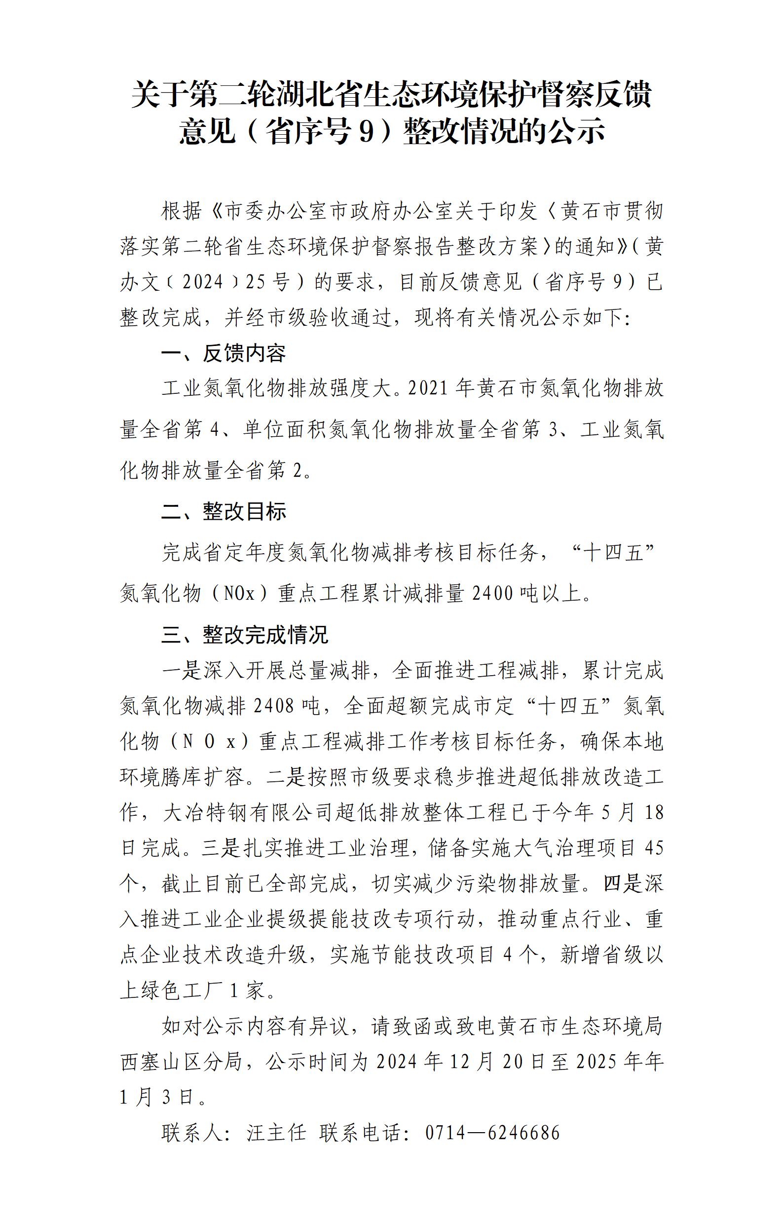 关于第二轮湖北省生态环境保护督察反馈意见(省序号9)整改情况的公示