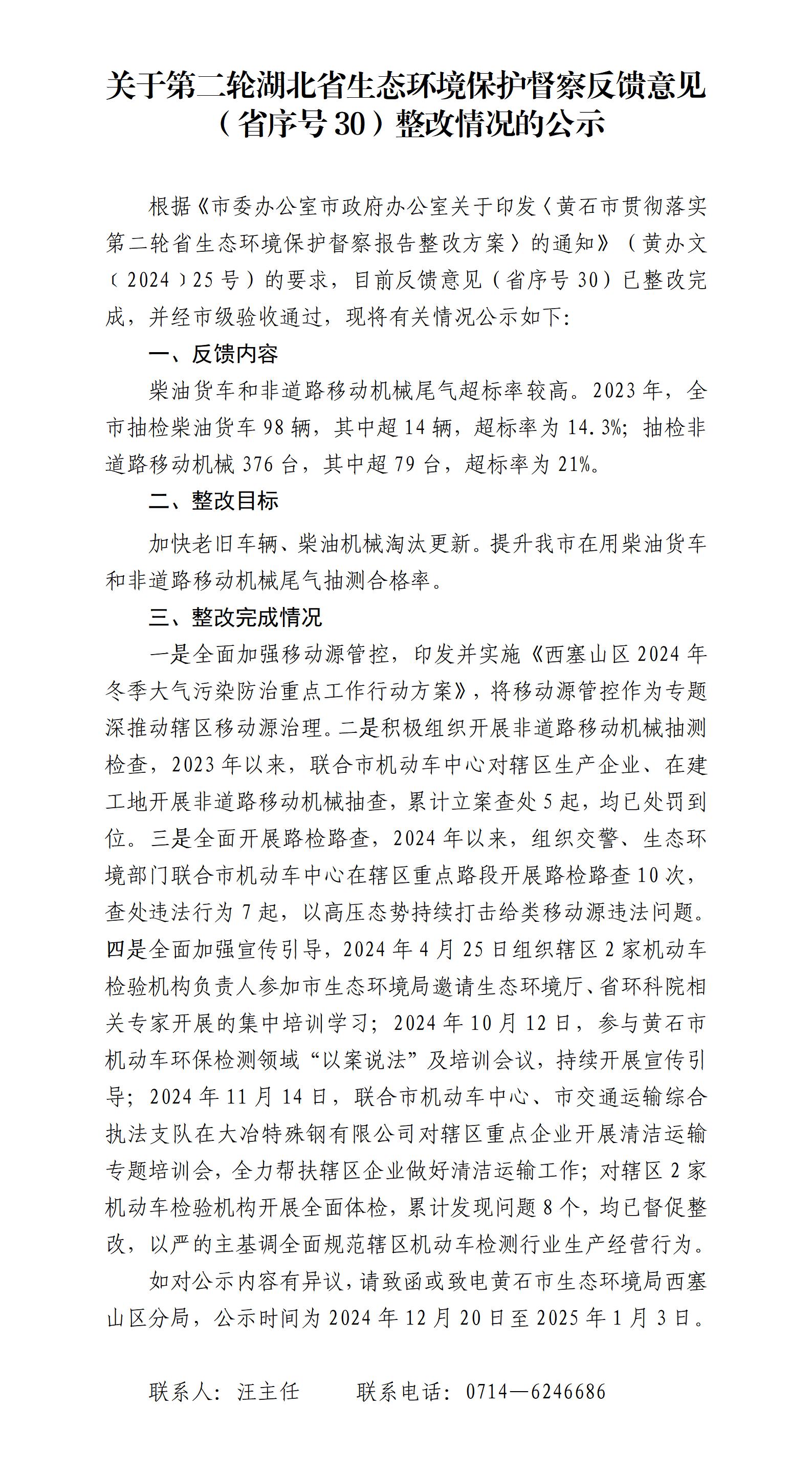 关于第二轮湖北省生态环境保护督察反馈意见(省序号30)整改情况的公示