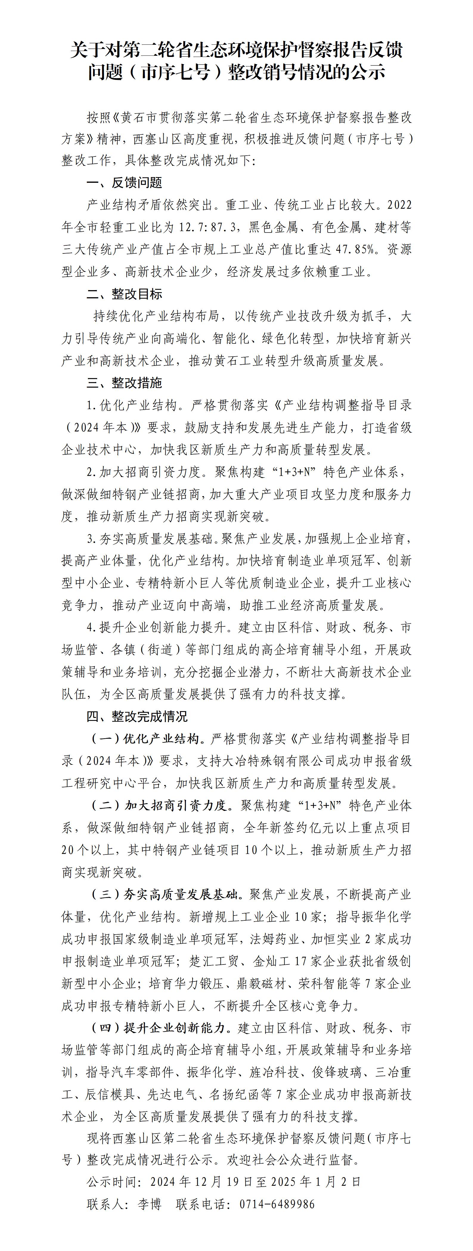 关于对第二轮省生态环境保护督察报告反馈问题(市序七号)整改销号情况的公示