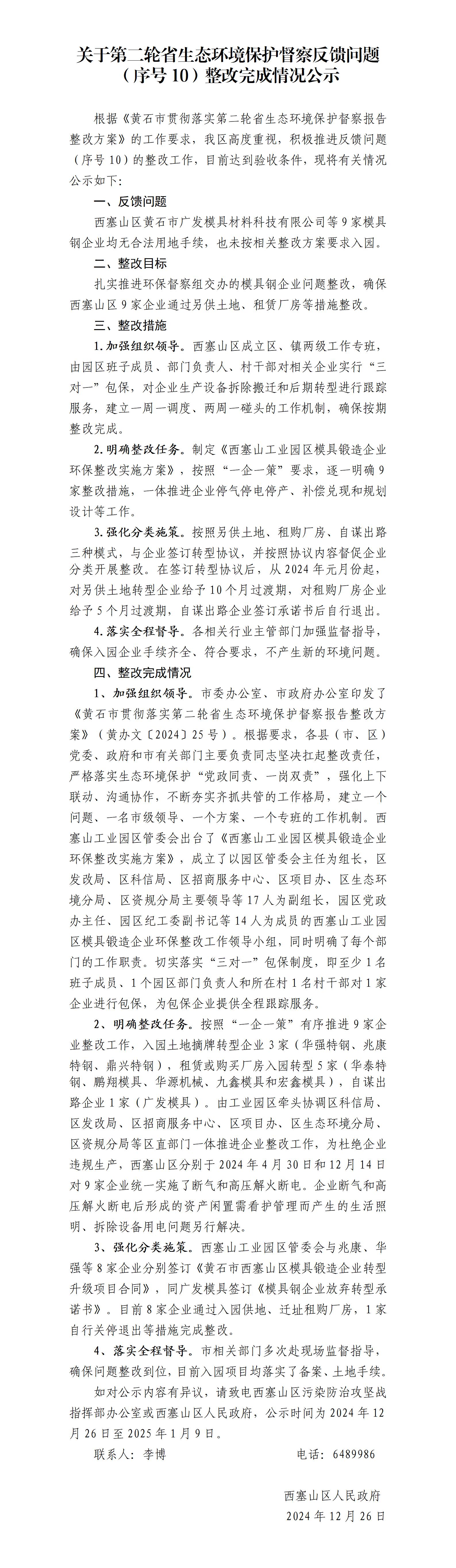 关于第二轮省生态环境保护督察反馈问题(序号10)整改完成情况公示