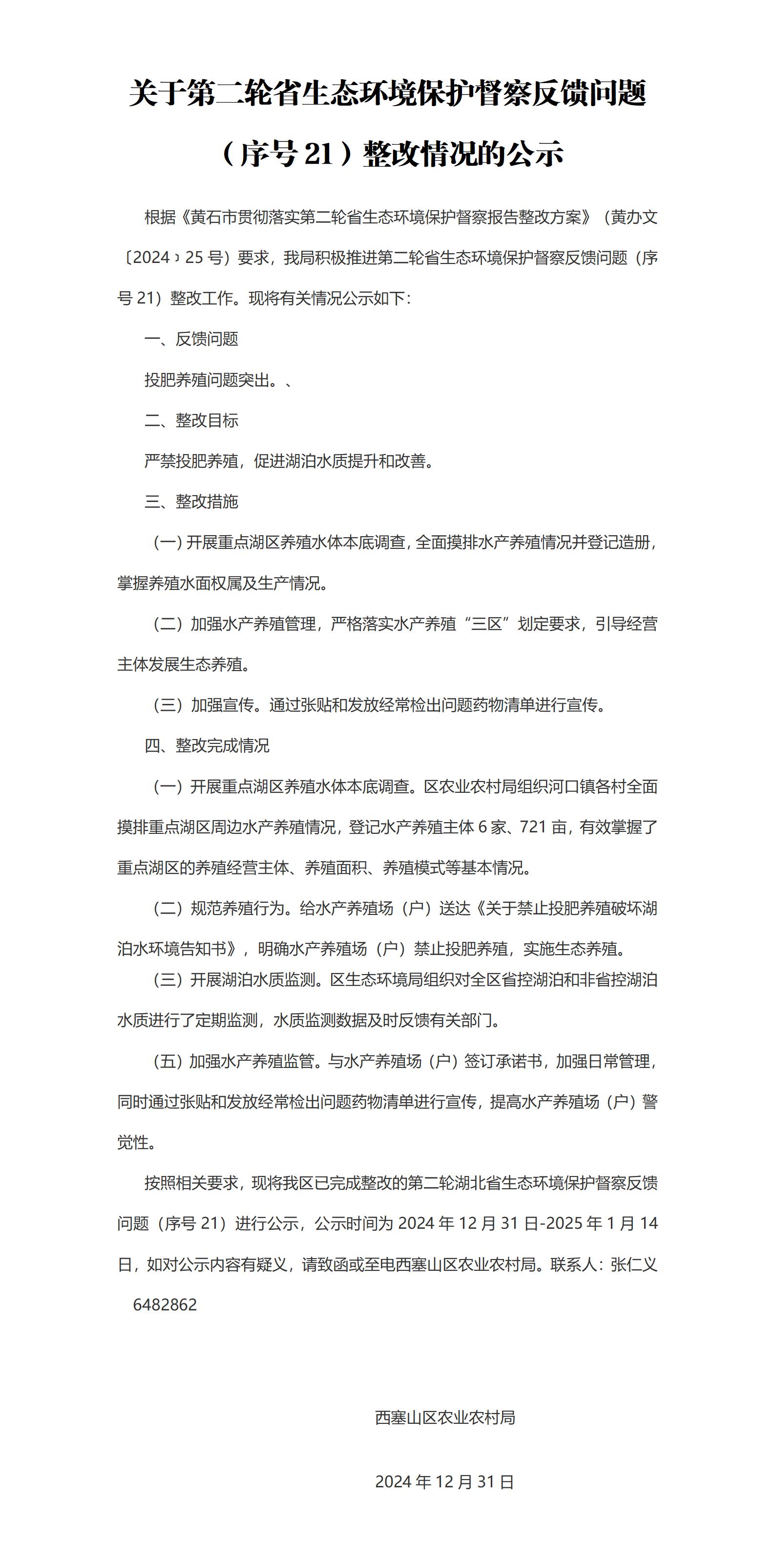 关于第二轮省生态环境保护督察反馈问题 (序号21)整改情况的公示
