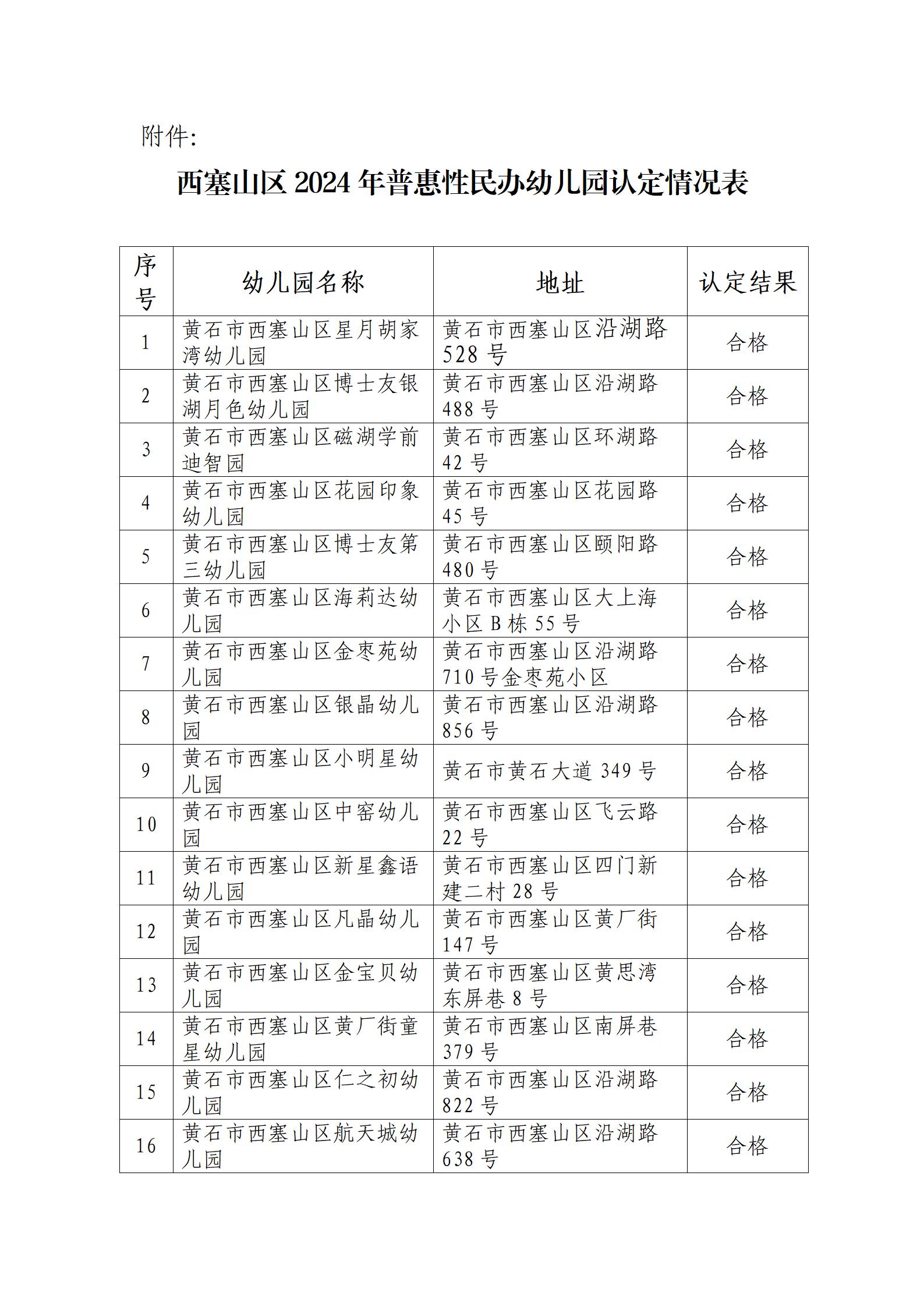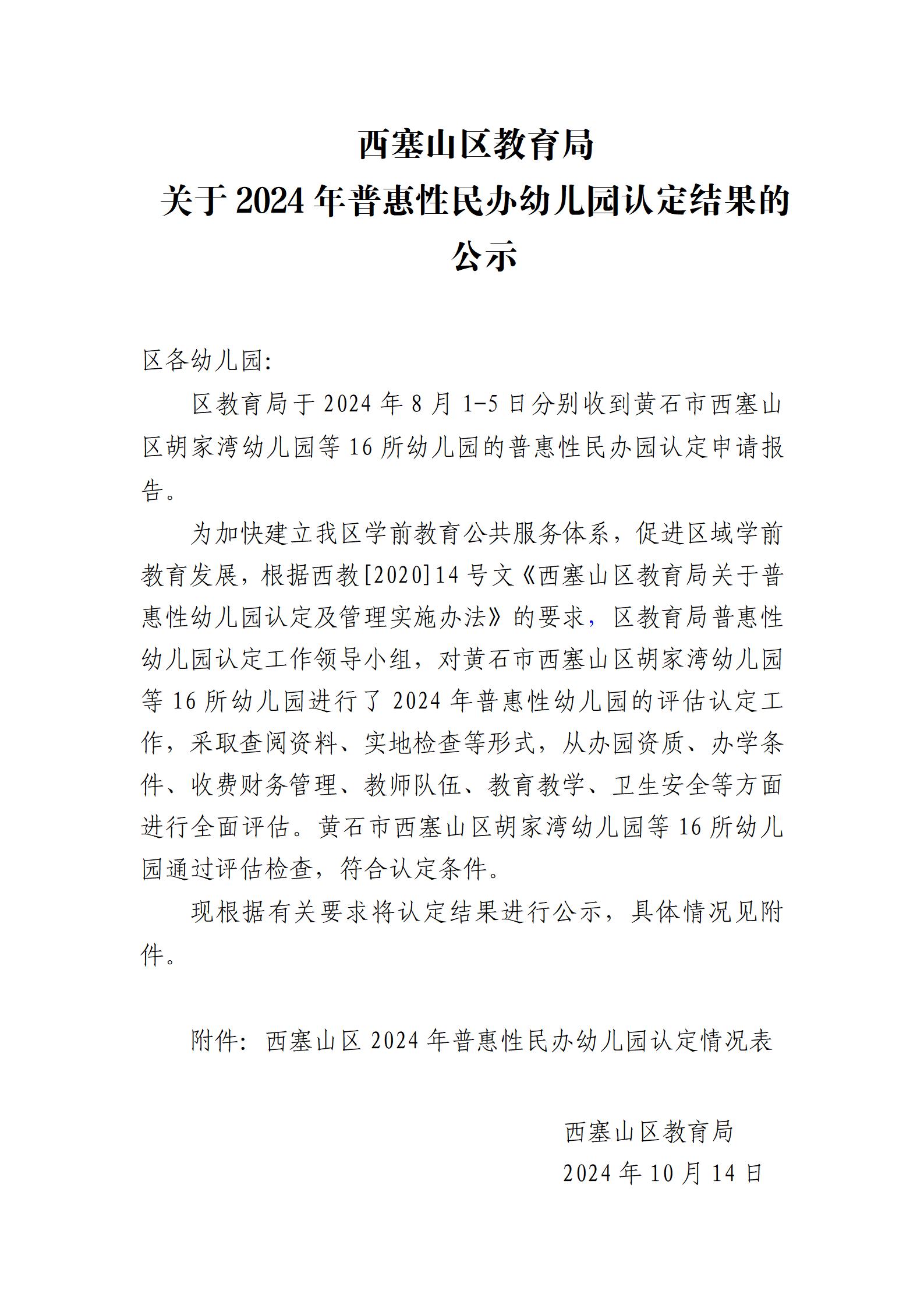 西塞山区教育局关于2024年普惠性民办幼儿园认定结果的公示