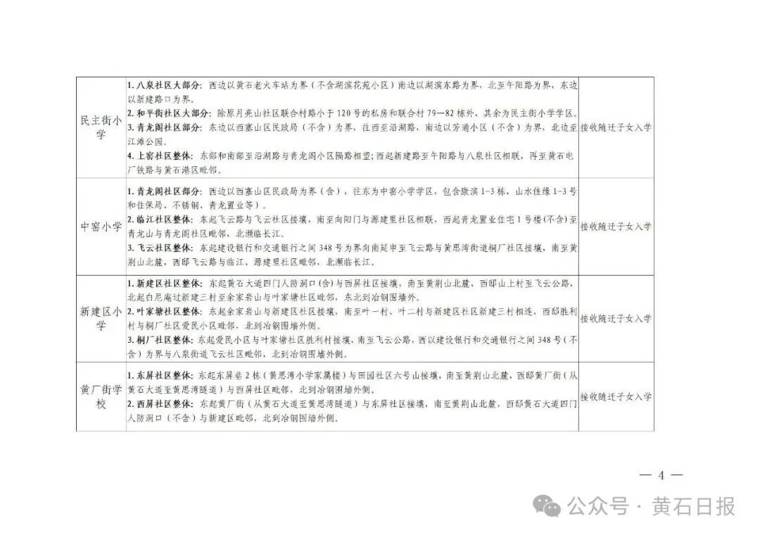 2、设立流动人口和进城务工随迁子女入学定点学校:黄石十六中教联体十六中临港学校、黄石九中教联体黄石市十七中学、黄石九中教联体黄石市二十一中学、黄石市龚家巷小学教联体黄石市磁湖小学、黄石市龚家巷小学教联体黄石市中窑小学、黄石市沿湖路小学教联体黄石市民主街小学、黄石市沿湖路小学教联体黄石市黄厂街学校、黄石市湖滨路小学教联体黄石市马家嘴小学、黄石市湖滨路小学教联体黄石市西塞学校等9所公办中小学。