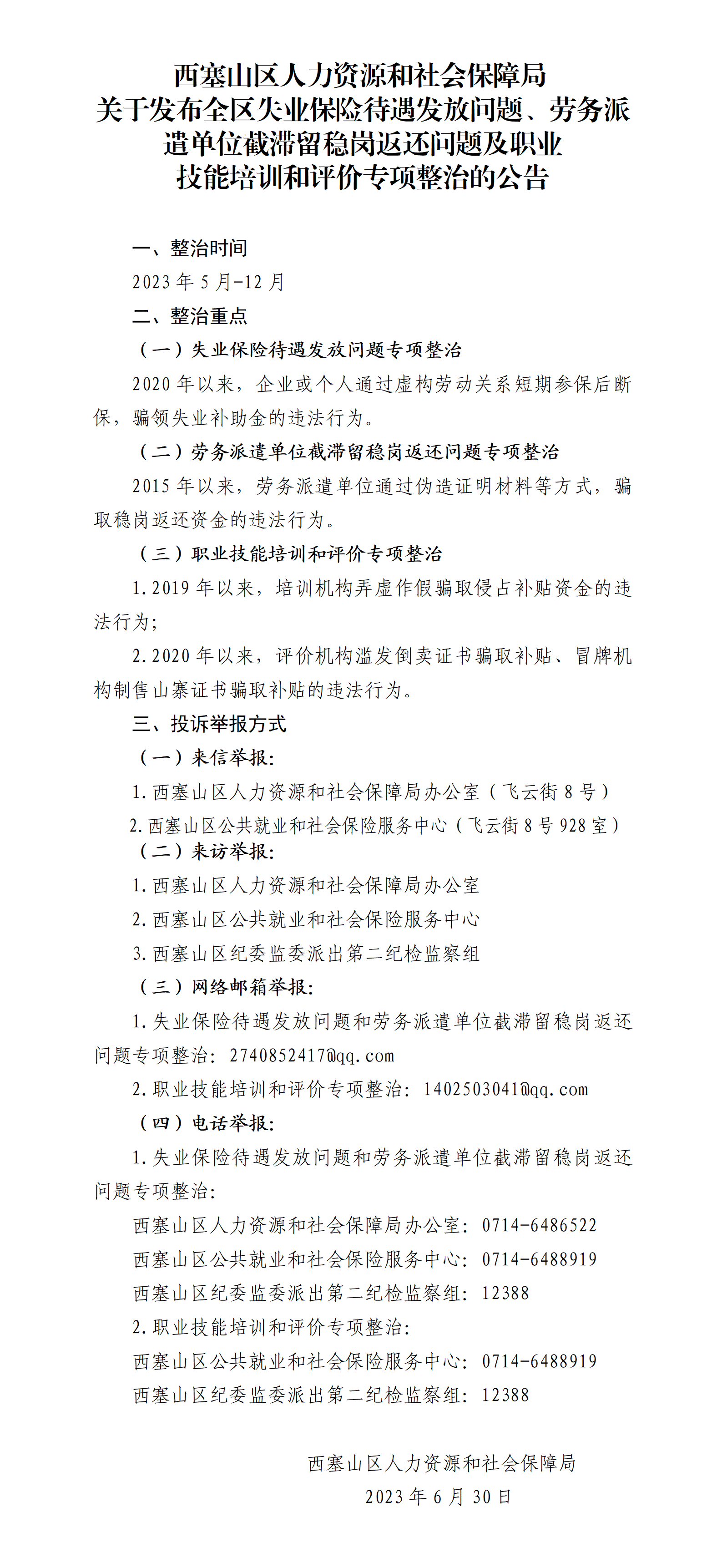 西塞山区人力资源和社会保障局关于发布全区失业保险待遇发放问题、劳务派遣单位截滞留稳岗返还问题及职业技能培训和评价专项整治的公告