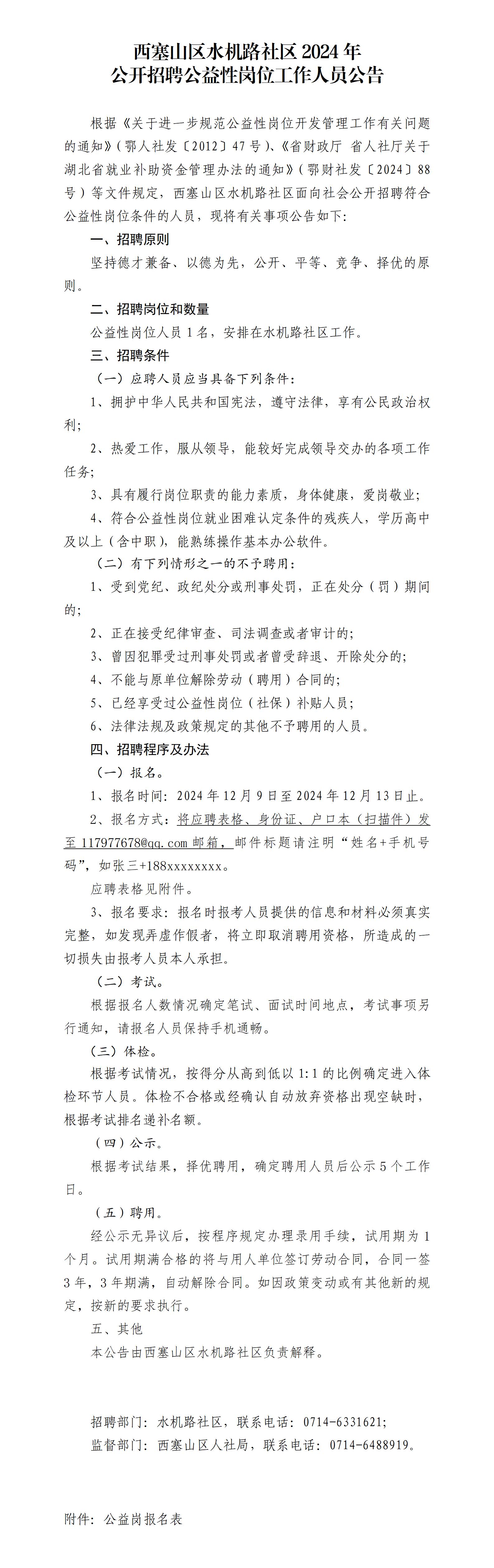 西塞山区水机路社区2024年公开招聘公益性岗位工作人员公告