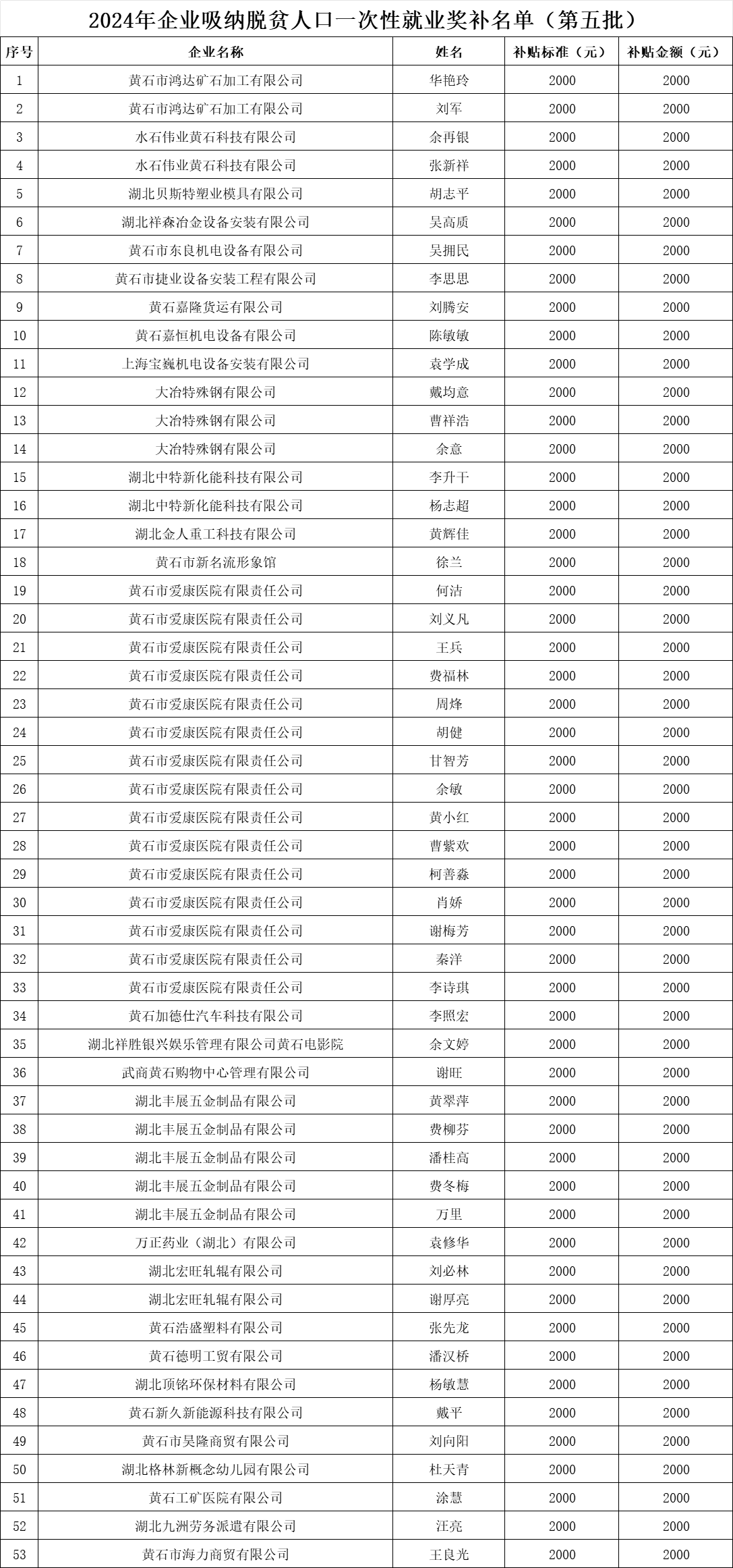 2024年企业吸纳脱贫人口一次性就业奖补名单(第五批)