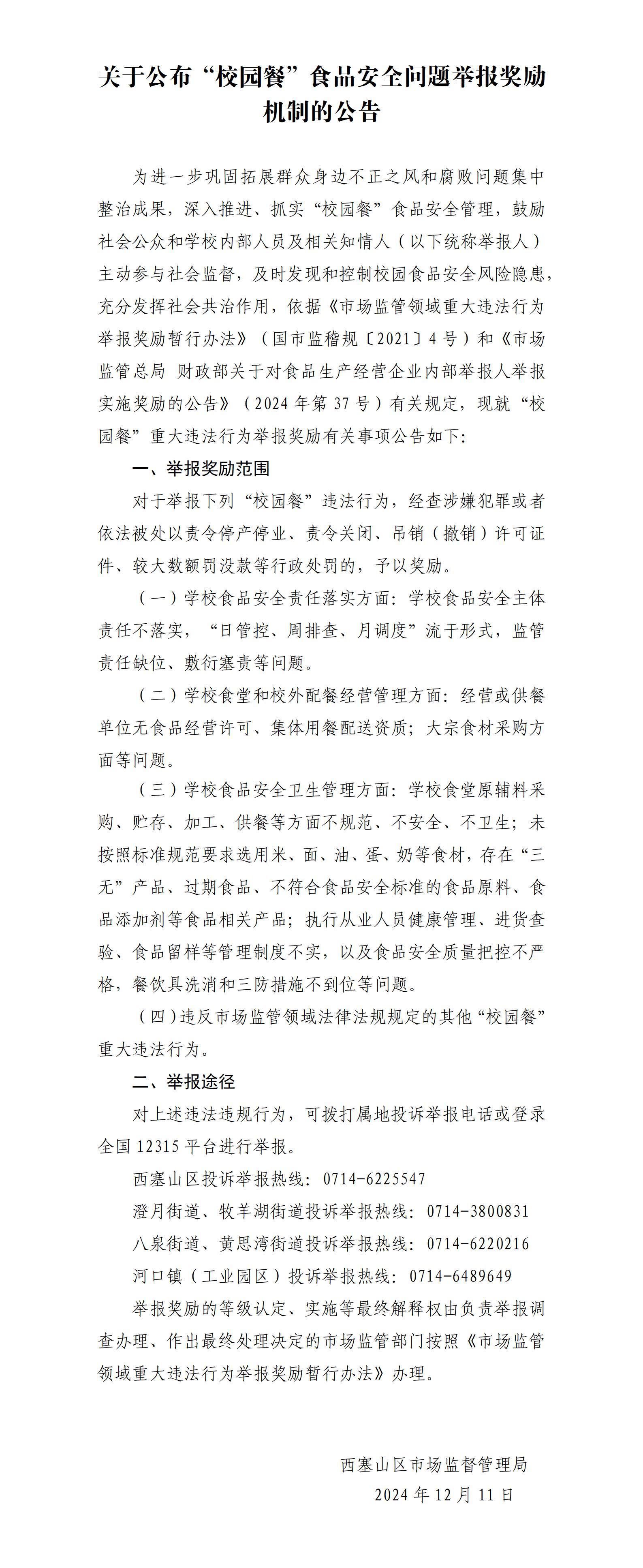 关于公布“校园餐”食品安全问题举报奖励机制的公告
