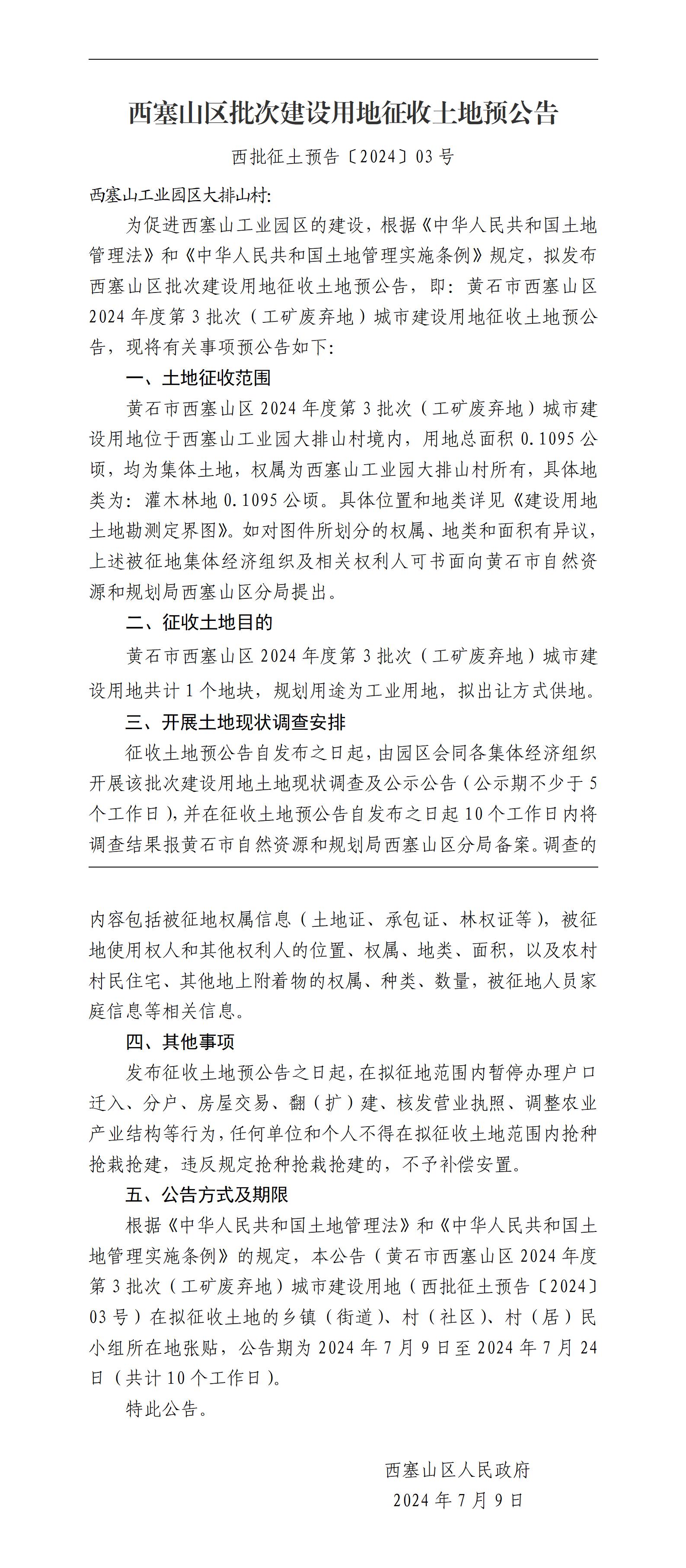 西塞山区批次建设用地征收土地预公告(西批征土预告〔2024〕03号)