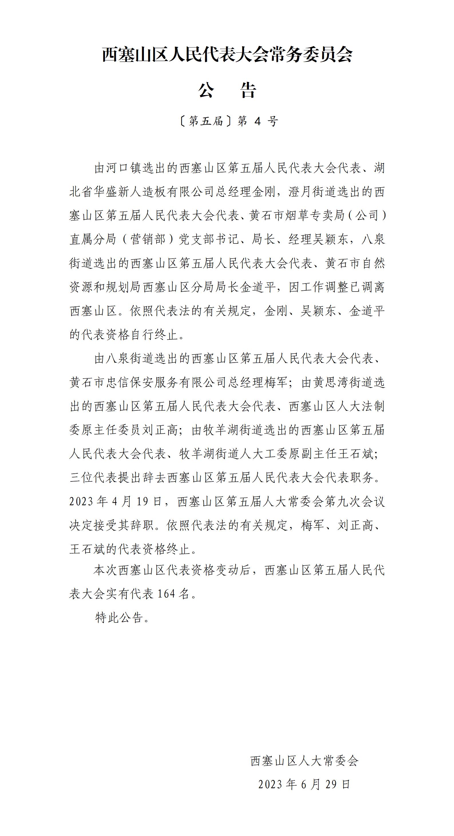 西塞山区人民代表大会常务委员会公告〔第五届〕第4号