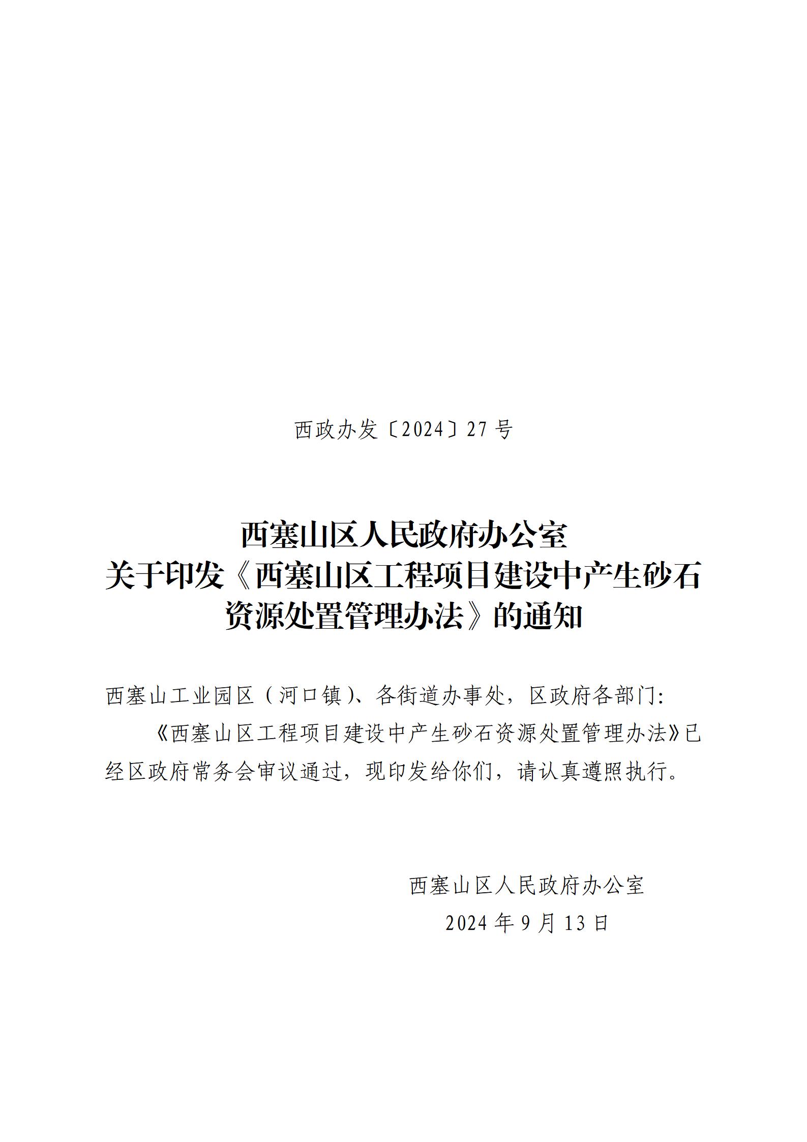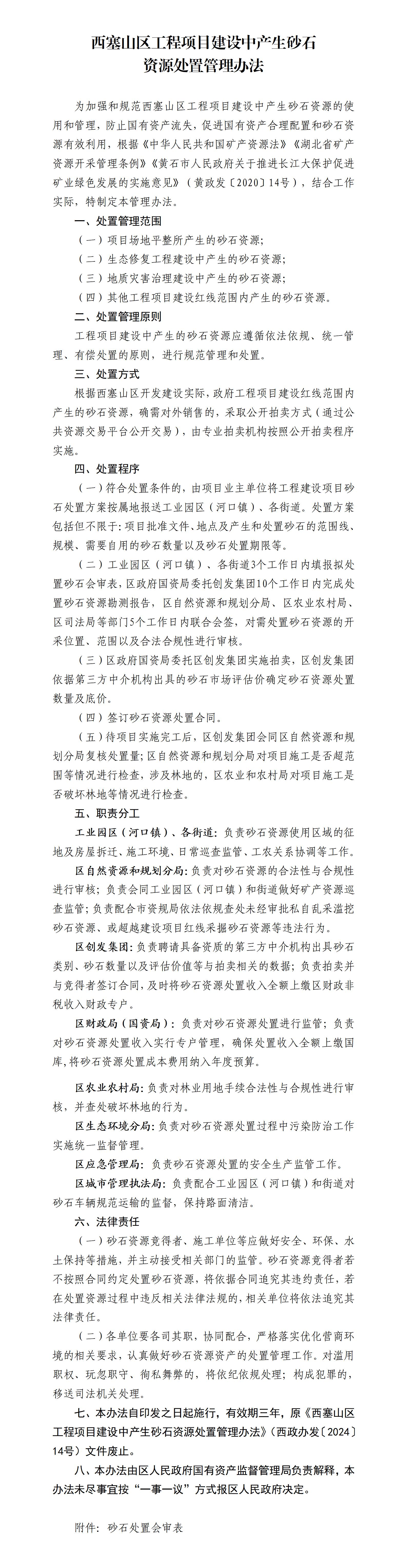 西塞山区人民政府办公室 关于印发《西塞山区工程项目建设中产生砂石资源处置管理办法》的通知
