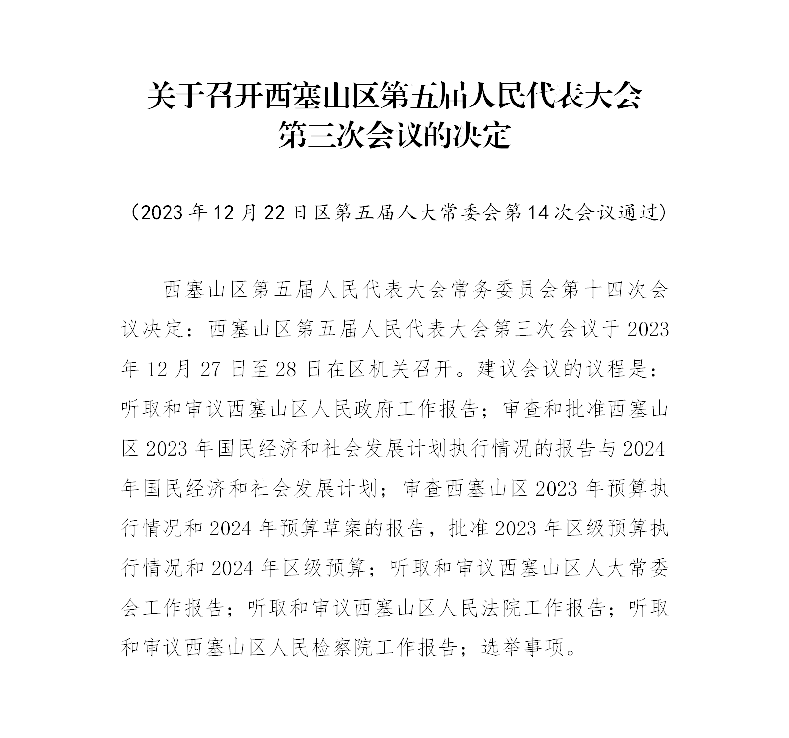 关于召开西塞山区第五届人民代表大会的决定
