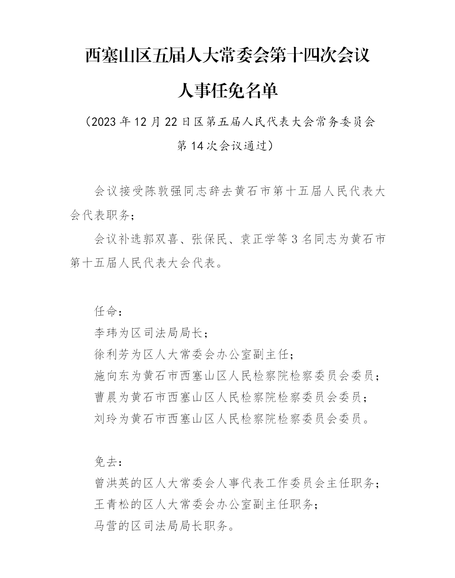 西塞山区五届人大常委会第十四次会议人事任免名单