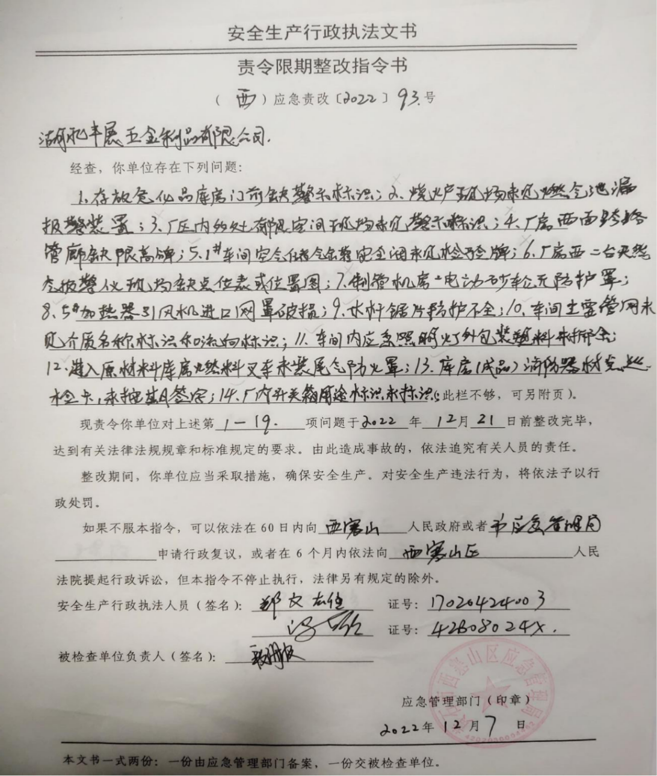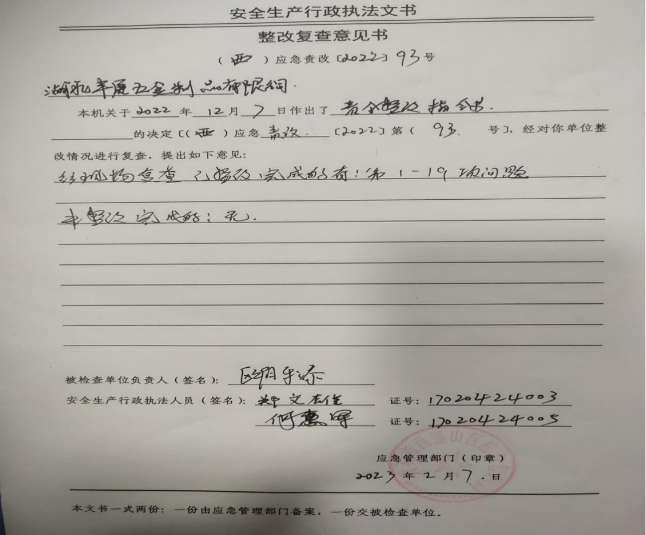 西塞山区应急管理局工贸科2022年四季度“双随机、一公开”专项执法检查结果公示