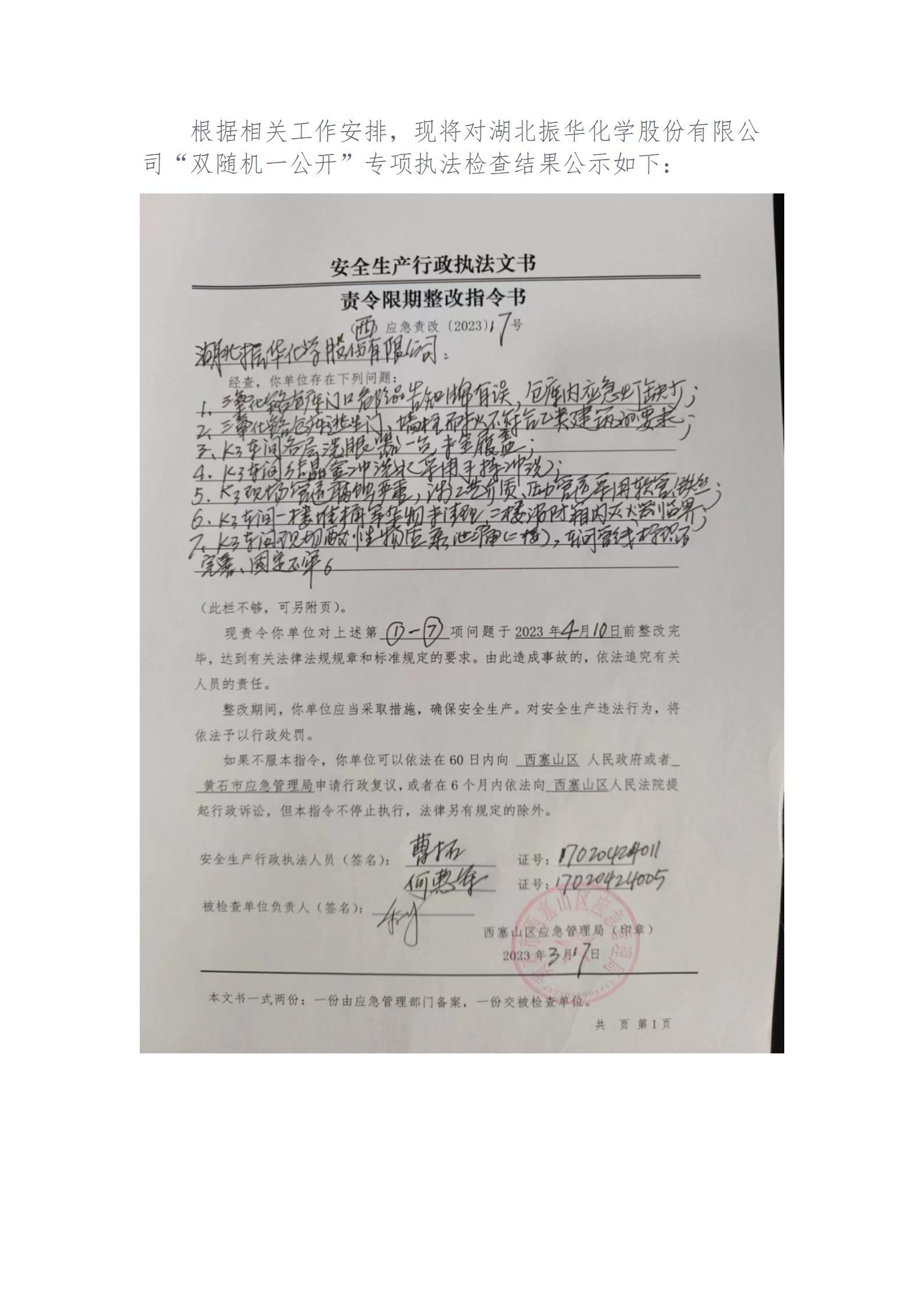 西塞山区应急管理局危化科2023年一季度“双随机、一公开”专项执法检查结果公示